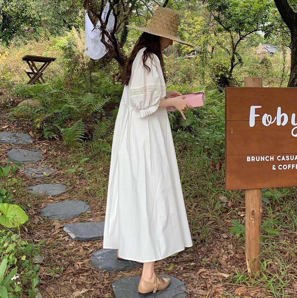 ワンピース ロング ロング丈 マキシ マキシ丈 9分丈 袖あり 5分袖 五分袖 ボリューム袖 パフスリーブ Uネック ラウンドネック 刺繍 ウエストマーク 透け感 かわいい きれいめ シンプル おしゃれ レトロ 大人可愛い 大人女子 ラブリー キュート ガーリー ルーズ 無地 春 夏 10代 20代 30代 40代 50代 60代 レディース 女性用 ママ マタニティ デート お出かけ 休日 リゾート 旅行 高原 ホテル ガーデン レストラン体形カバー インスタ映え フリーサイズ ゆったり 白 ホワイト