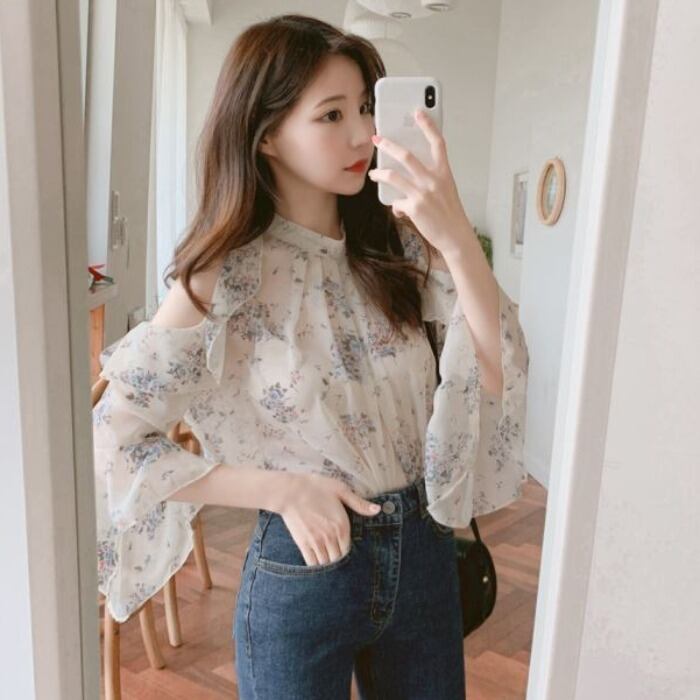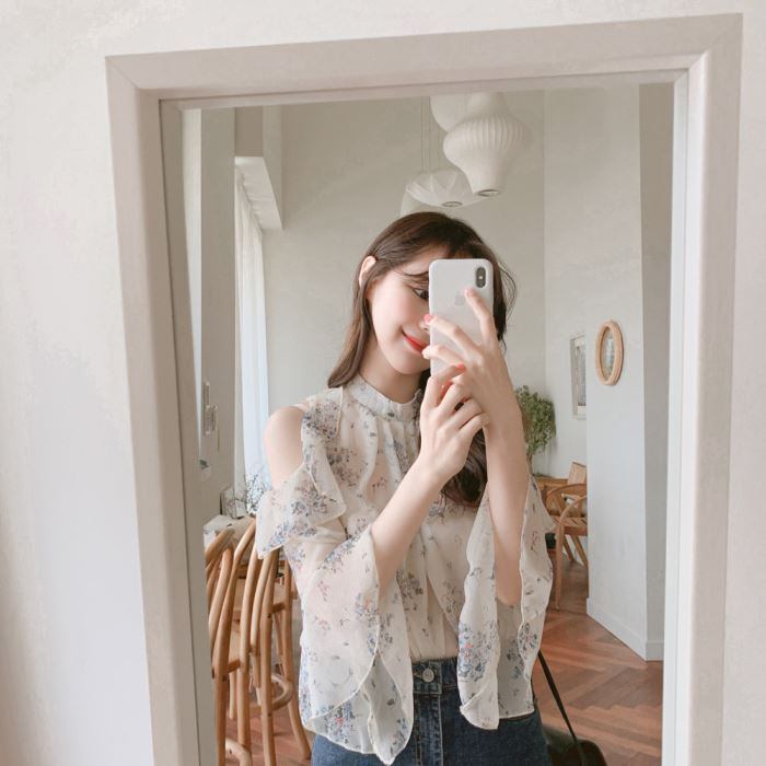 肩の部分がざっくり開いたお洒落な花柄シフォンシャツです