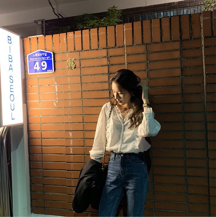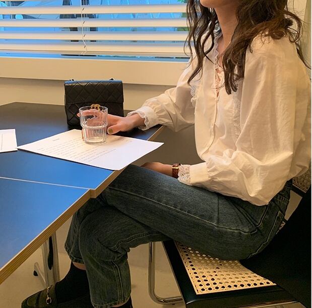 レースフリルが可愛いフェミニンなシャツブラウス。