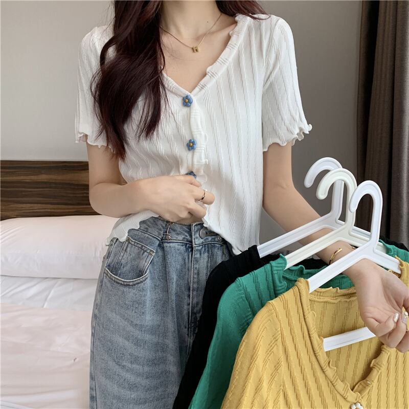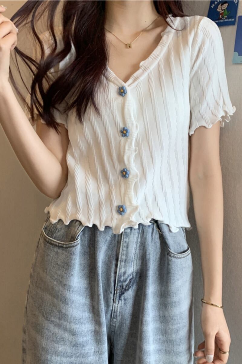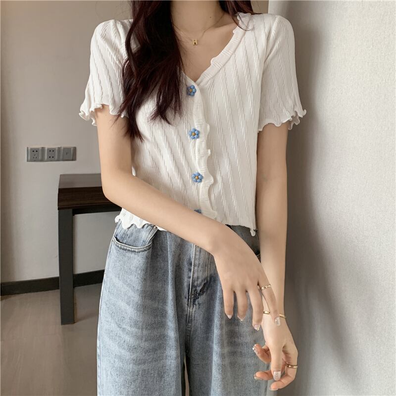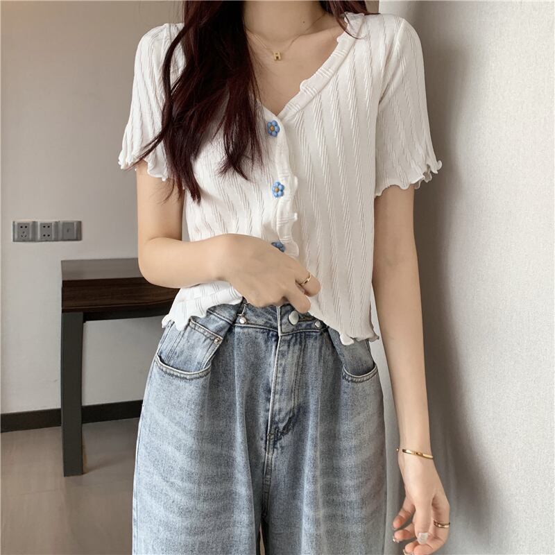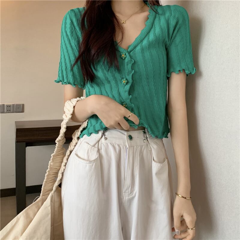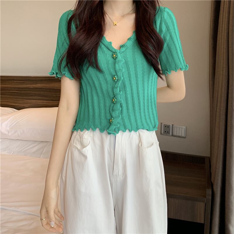 トップス Tシャツ ニットソー カーディガン ショート丈 袖あり 半袖 萌袖 フリル袖 Vネック 襟なし スリム タイト 細身 ストレート スマート フリル 柔らかい かわいい カジュアル おしゃれ お洒落 アジアン ラブリー ガーリー 主役級 無地 ストライプ 春 夏 秋 誕生日 10代 20代 レディース 女性用 女の子 学生 通学 デート お出かけ 女子会 休日 イベント リゾート 旅行 海 プール 普段使い 韓国 韓国系 ファッション スタイル インスタ映え ホワイト ブラック グリーン