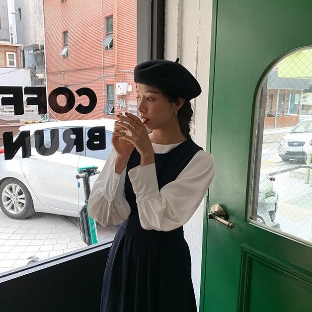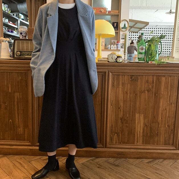 ウエスト部分にギャザーを寄せたシンプルなミモレ丈ジャンパースカート。