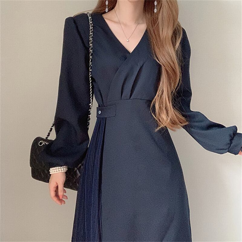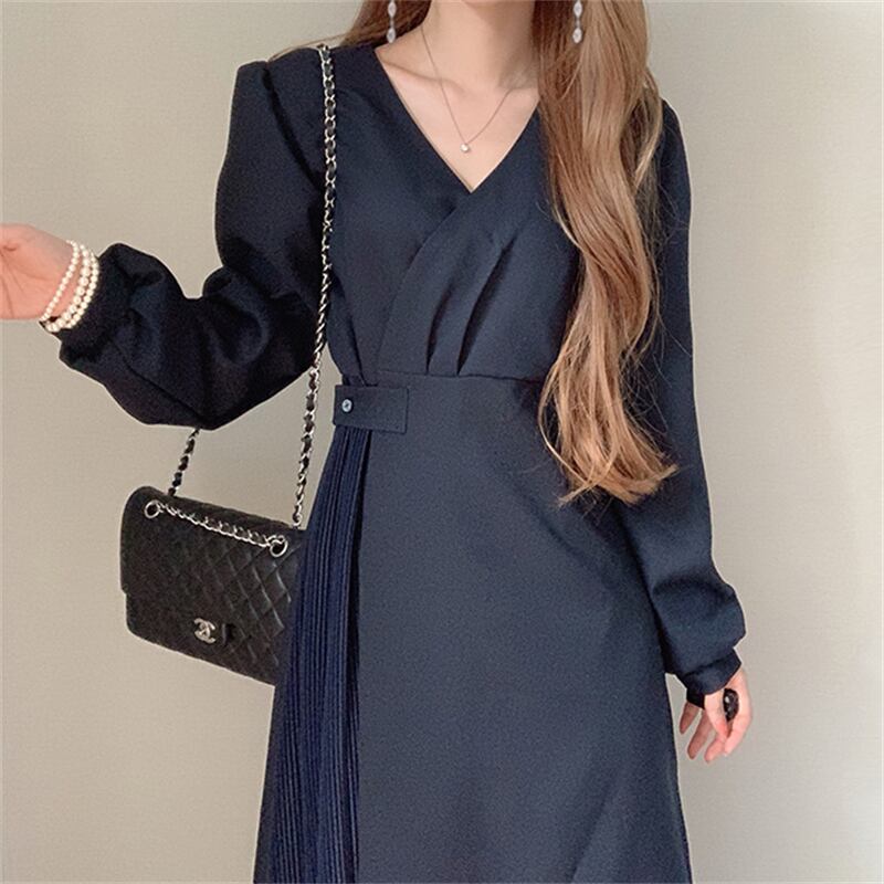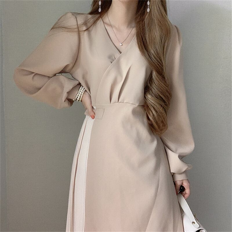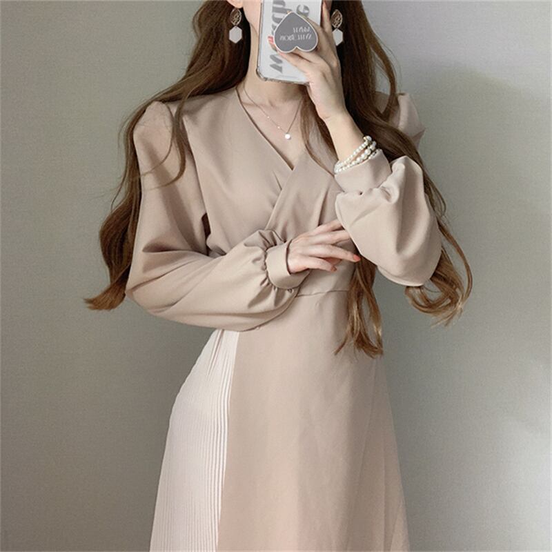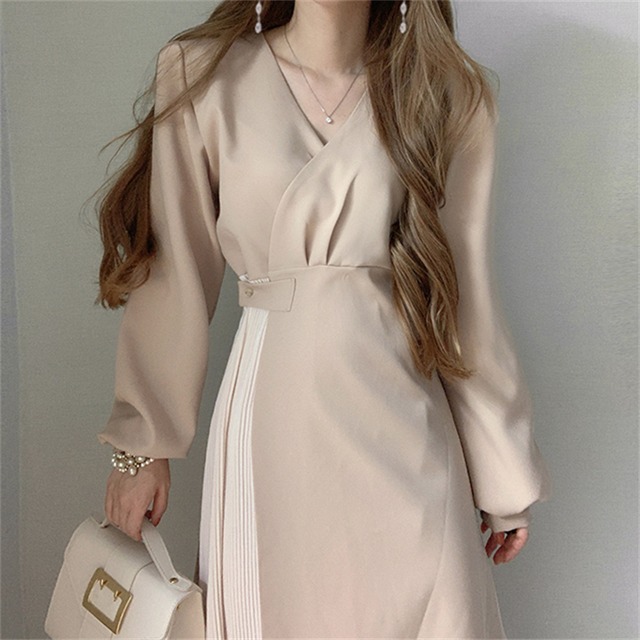 ドレス ワンピース パーティードレス 結婚式のドレス フォーマルドレス ロング丈 袖あり 長袖 ボリューム袖 Vネック 襟なし スリム 細身 ストレート プリーツ リボン ハイウエスト 大人可愛い きれいめ シンプル 上品 お洒落 大人女子 個性的 フォーマル モダン 無地 20代 30代 40代 レディース ママ 韓国系 脚長 プレゼント 高見え 春 秋 冬 結婚式 二次会 1.5次会 お呼ばれ パーティー 卒業式 卒園式 舞台 フリーサイズ ベージュ ネイビー