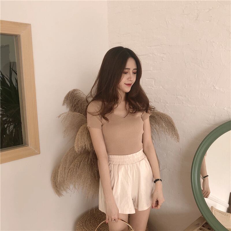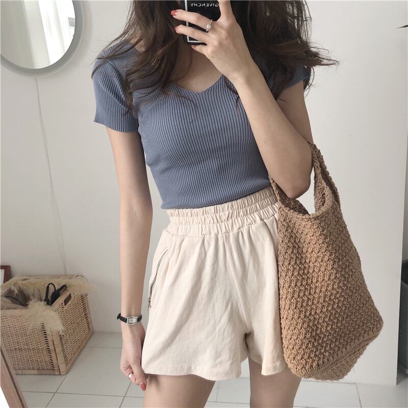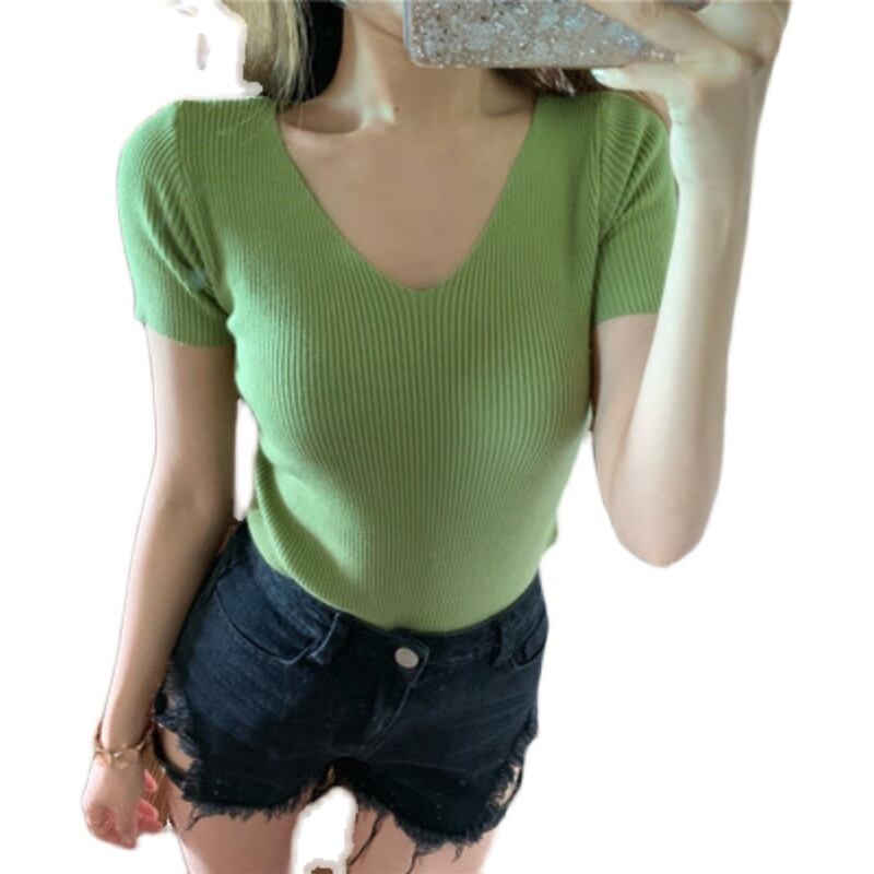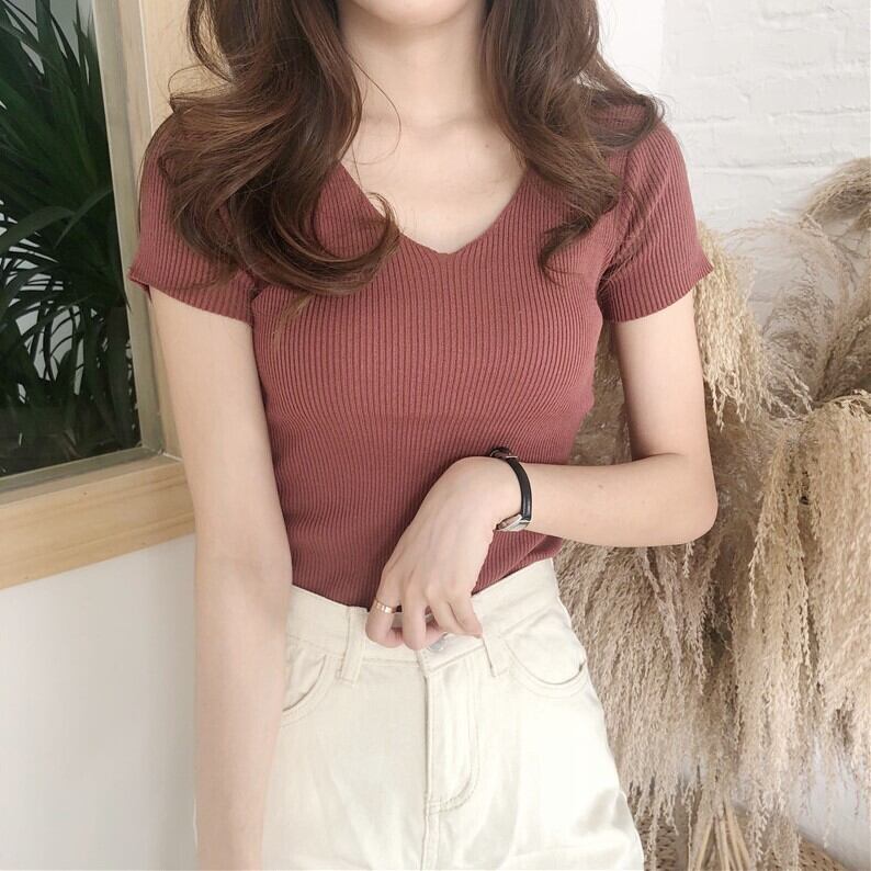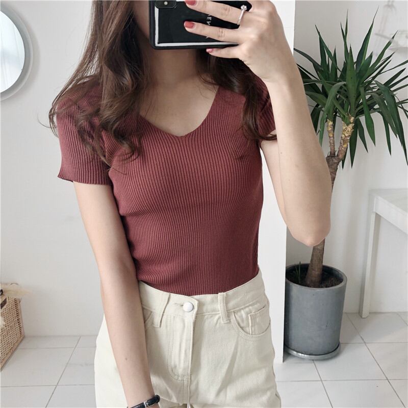Vネックの半袖リブトップスです