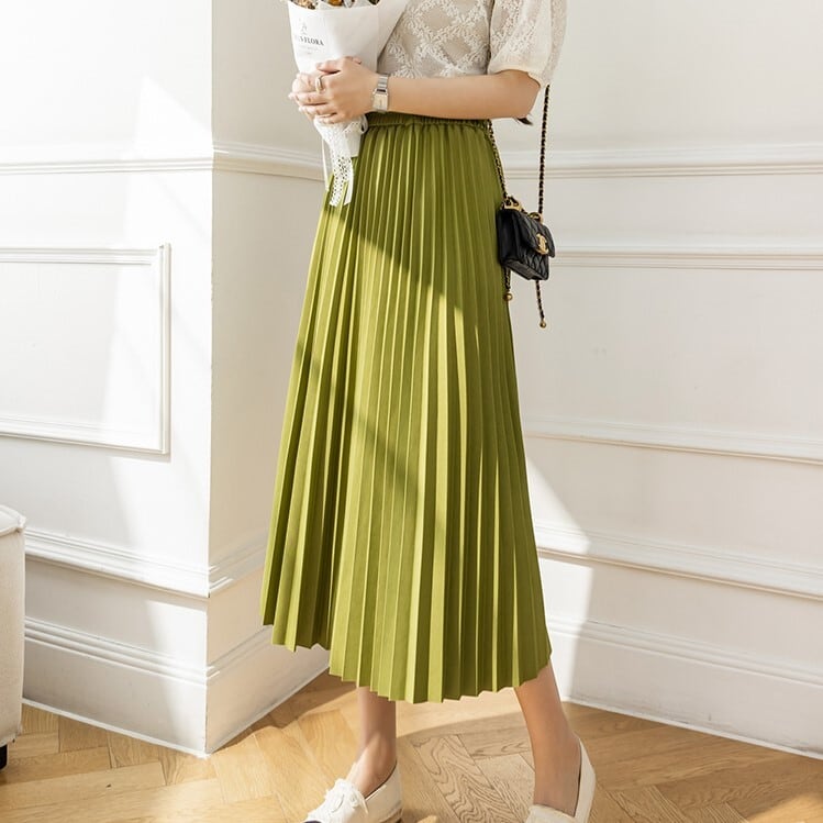 スカート ボトムス ロングスカート プリーツスカート ミモレ ミモレ丈 ロング ロング丈 プリーツ かわいい 大人可愛い きれいめ シンプル 大人 上品 おしゃれ お洒落 無地 春 夏 秋 冬 オールシーズン 10代 20代 30代 40代 レディース 女性用 オフィス ビジネス OL 通勤 学生 通学 デート お出かけ 女子会 休日 イベント リゾート 旅行 海 モテ S M L XL 黒 ブラック 緑 グリーン アプリコット