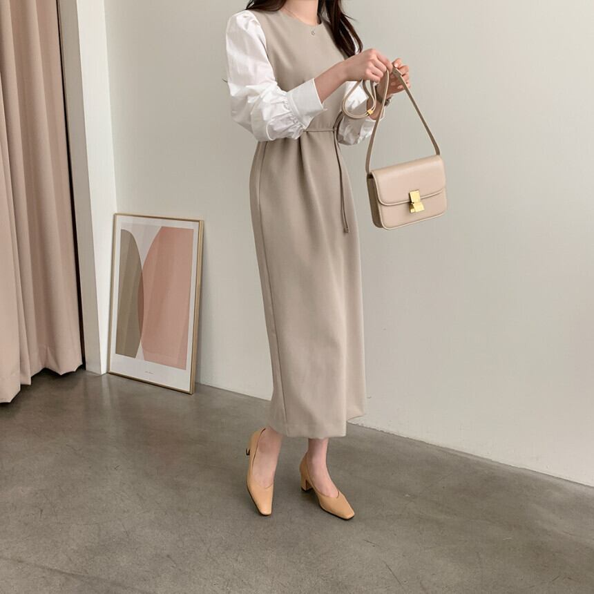 ワンピース 膝下 ミモレ ミモレ丈 ロング ロング丈 袖あり ボリューム袖 Uネック クルーネック 細身 マーメイド ウエストマーク ドッキング かわいい 大人可愛い きれいめ シンプル 大人 上品 大人可愛い 大人女子 ガーリー フォーマル 無地 春 夏 秋 冬 オールシーズン 20代 30代 40代 レディース 女性用 ビジネス OL 通勤 デート お出かけ 女子会 休日 フリーサイズ 黒 ブラック オフホワイト ベージュ アプリコット