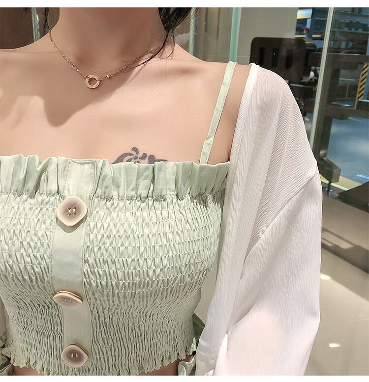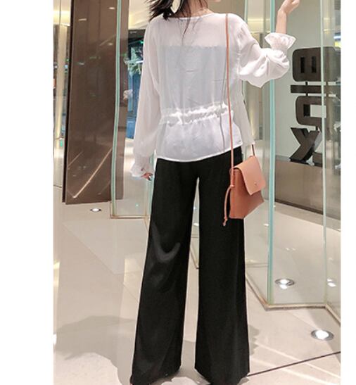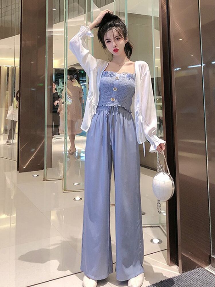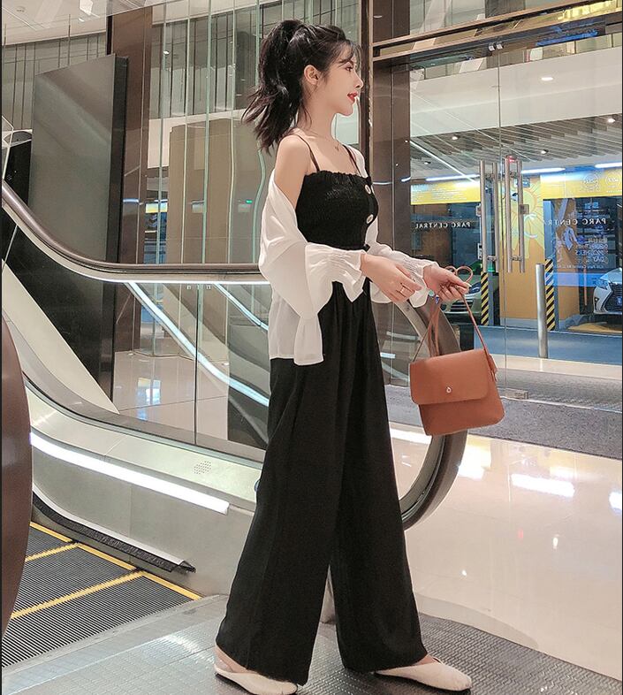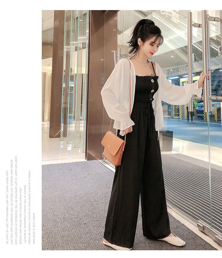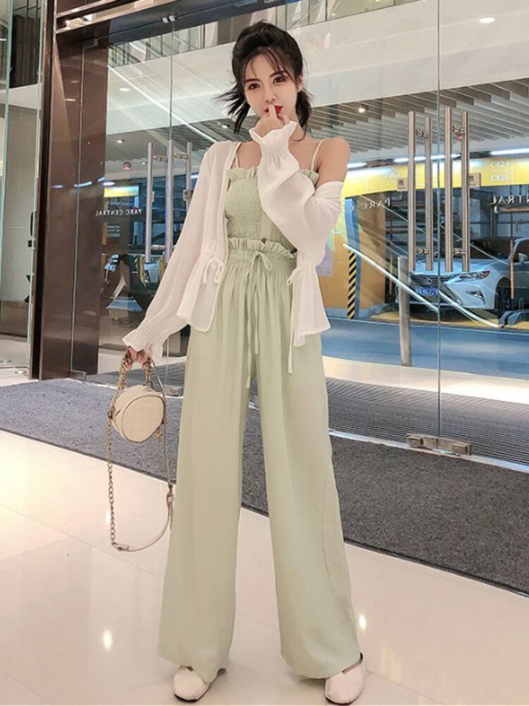 カーディガン、キャミソール、ワイドパンツのスリーピースセットです。