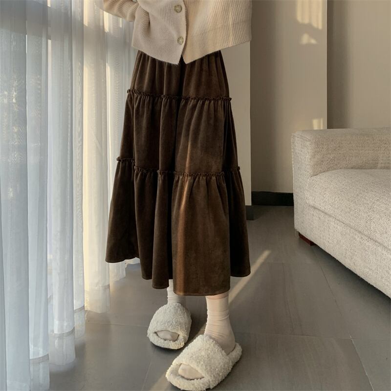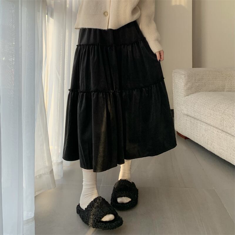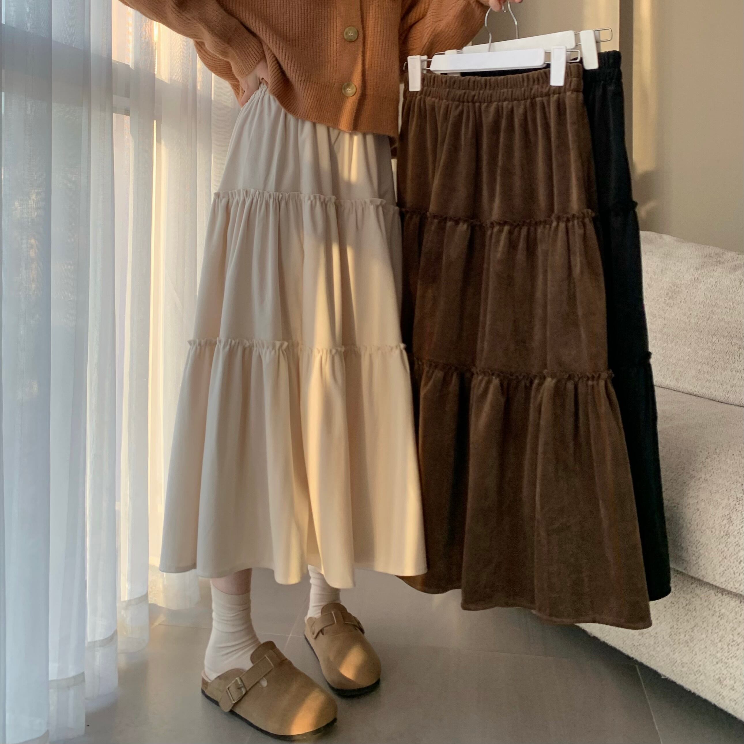 スカート ボトムス ロングスカート フレアスカート 膝下 ミモレ ミモレ丈 ロング ロング丈 フレア かわいい 上品 ラブリー キュート ガーリー 無地 秋 冬 10代 20代 レディース 女性用 学生 通学 デート お出かけ 女子会 休日 暖かい フリーサイズ 黒 ブラック 茶色 ブラウン ベージュ