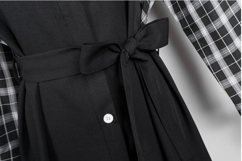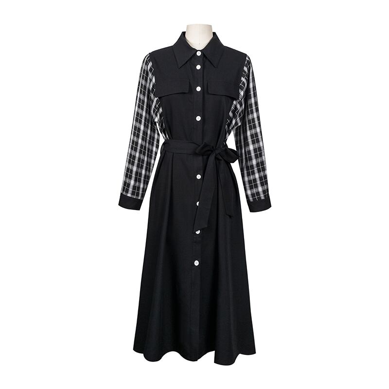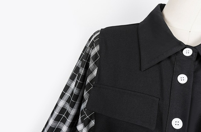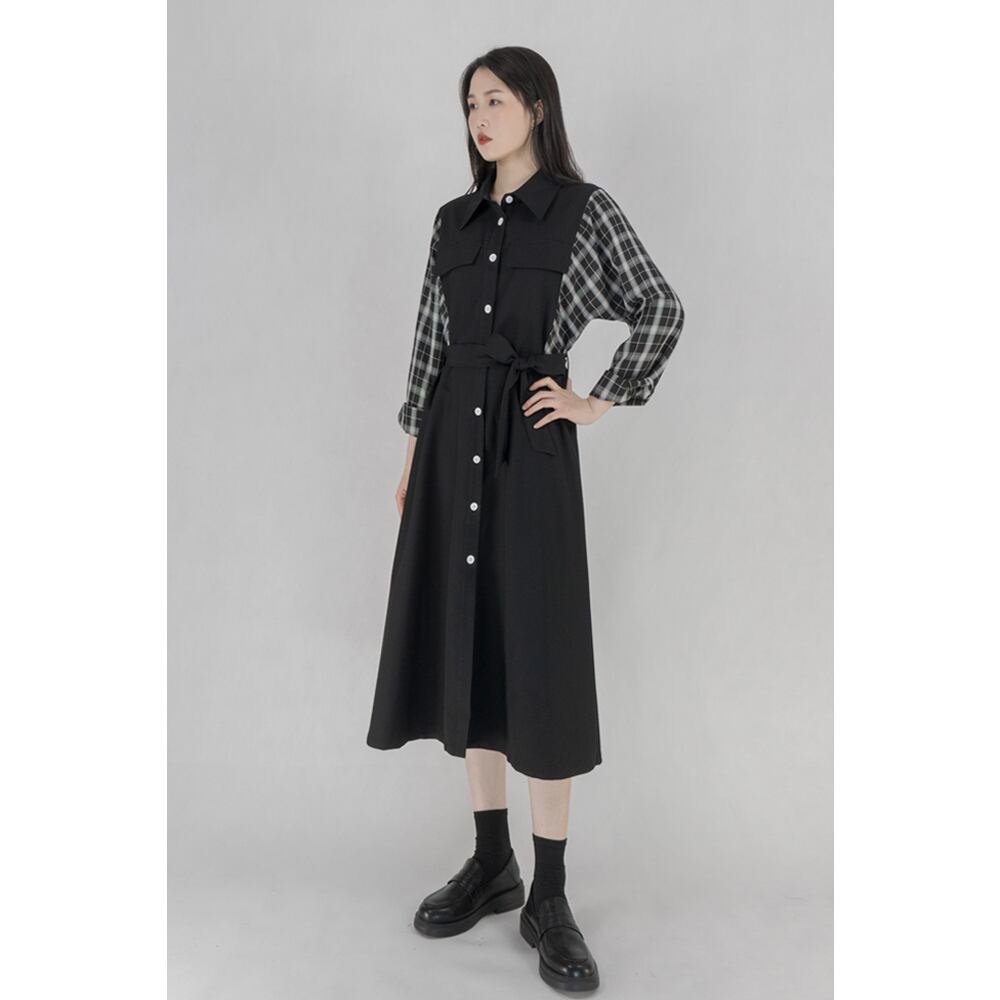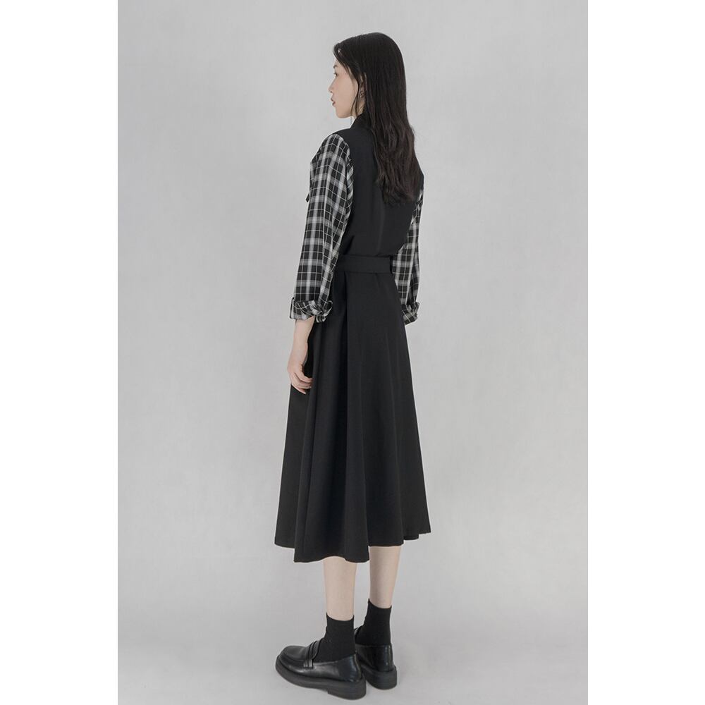 無地のワンピースに切り替えのチェック柄の袖がアクセント。