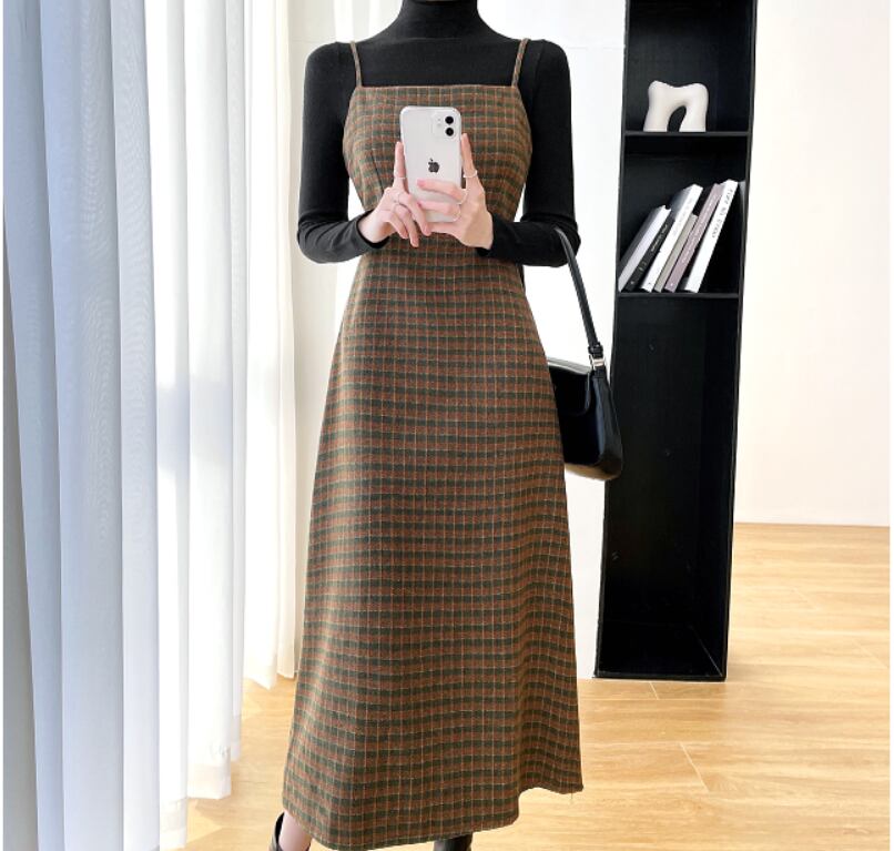 これからの秋冬にぴったりなチェック柄キャミソールワンピース。タートルネックのインナーと二点セットです。