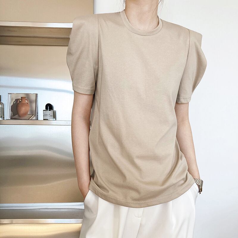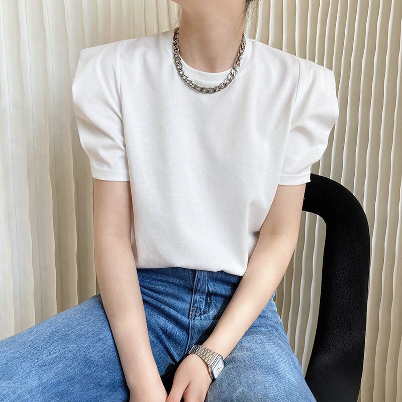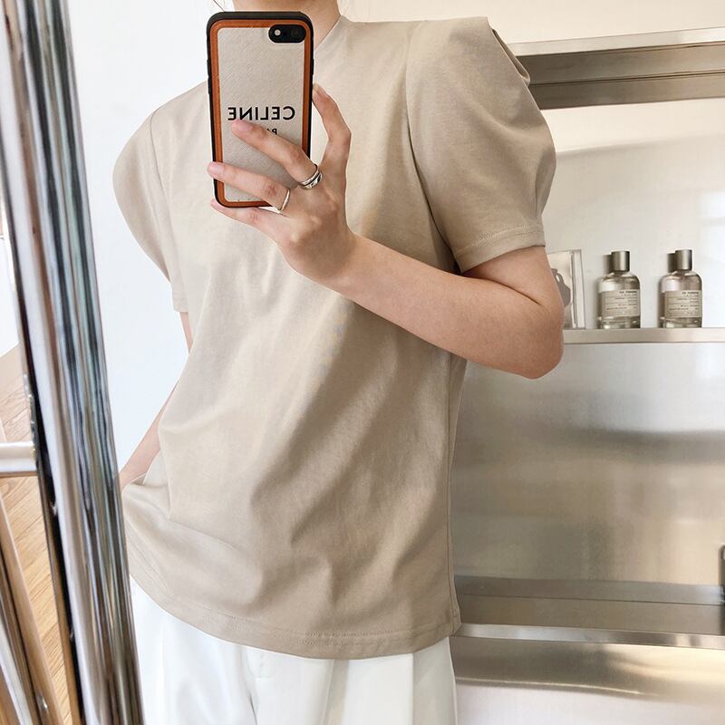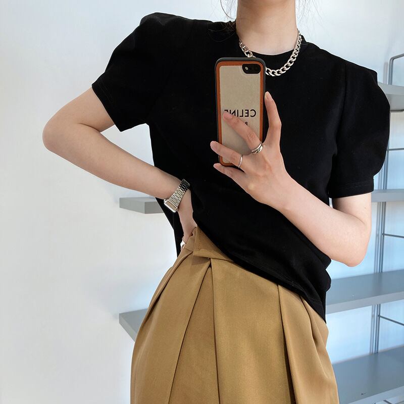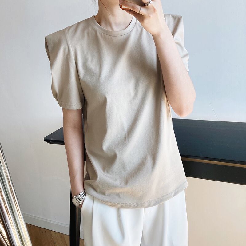 トップス Tシャツ 袖あり 半袖 パフスリーブ ラウンドネック 襟なし スリム スマート 細身 きれいめ シンプル 上品 おしゃれ かっこいい 大人女子 ラフ ボーイッシュ スポーティー フォーマル 無地 春 夏 秋 入学式 入園式 20代 30代 40代 レディース 女の子 ビジネス OL 通勤 パーティー イベント リクルート 着回し 重ね着 韓国 韓国系 サイズ M L 色展開 ホワイト ブラック ブルー ベージュ