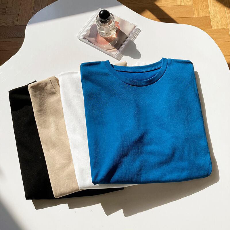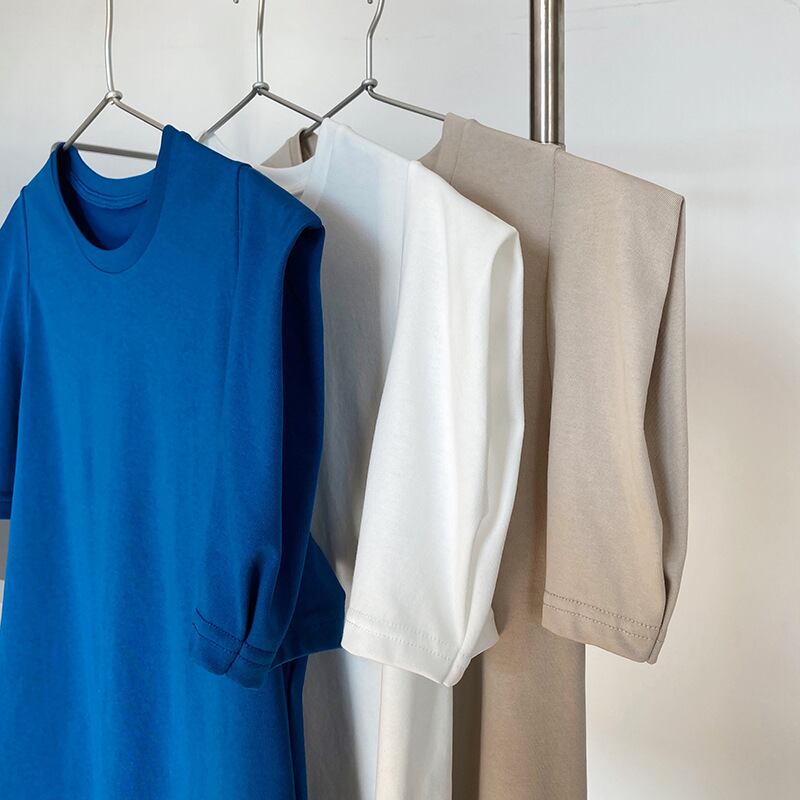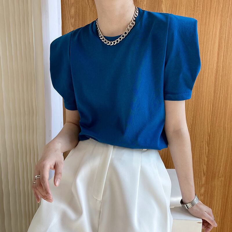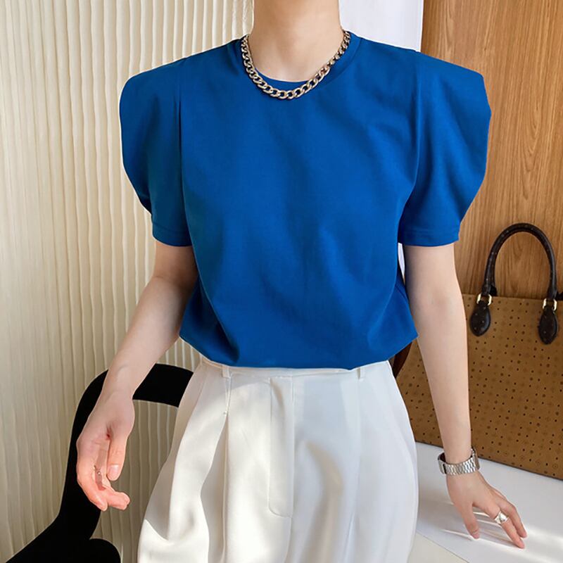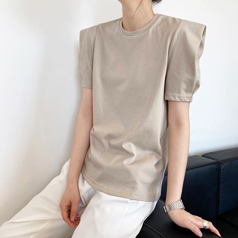 トップス Tシャツ 袖あり 半袖 パフスリーブ ラウンドネック 襟なし スリム スマート 細身 きれいめ シンプル 上品 おしゃれ かっこいい 大人女子 ラフ ボーイッシュ スポーティー フォーマル 無地 春 夏 秋 入学式 入園式 20代 30代 40代 レディース 女の子 ビジネス OL 通勤 パーティー イベント リクルート 着回し 重ね着 韓国 韓国系 サイズ M L 色展開 ホワイト ブラック ブルー ベージュ