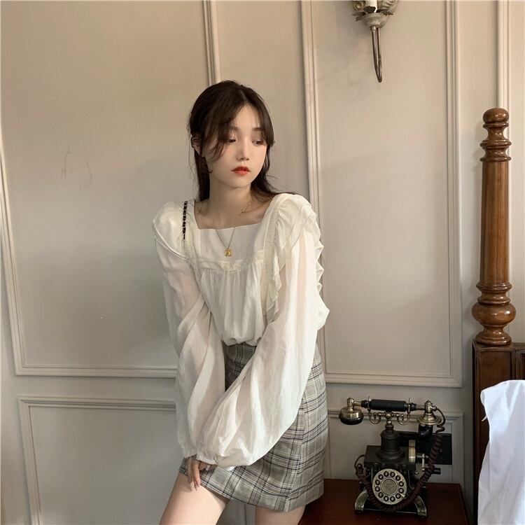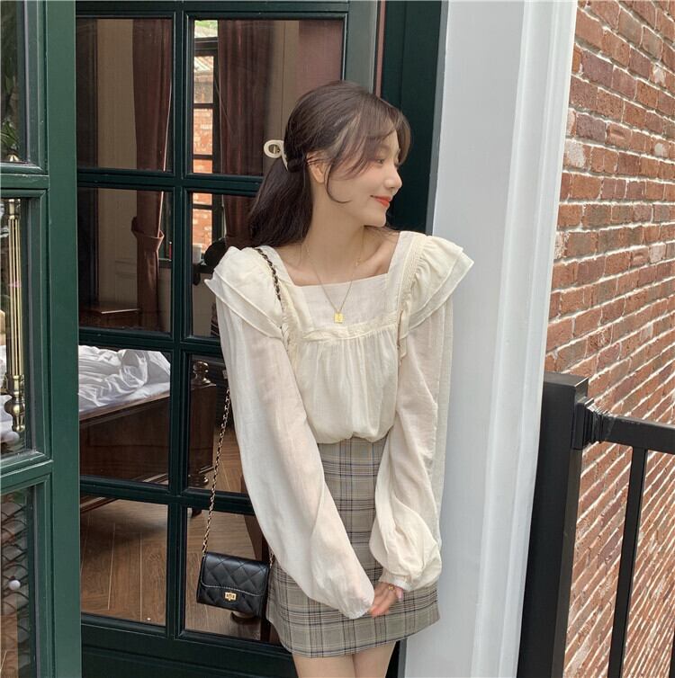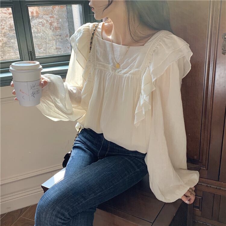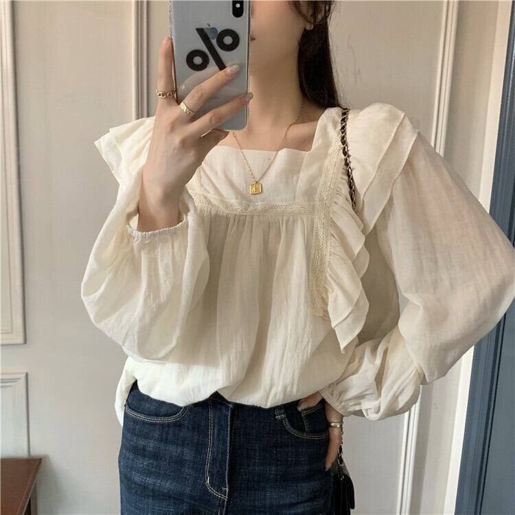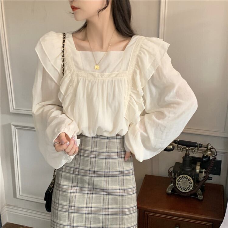 トップス ブラウス 袖あり 長袖 スクエアネック 襟なし パフスリーブ フリル ストレート ふわふわ かわいい カジュアル おしゃれ お洒落 レトロ 大人可愛い ラブリー キュート 主役級 無地 春 夏 秋 冬 誕生日 母の日 10代 20代 30代 40代 レディース 女性用 ママ 学生 通学 デート 公園デビュー ガーデン 着回し 普段使い 重ね着 お揃い 双子 韓国 コーデ 楽ちん ギフト S M L アプリコット