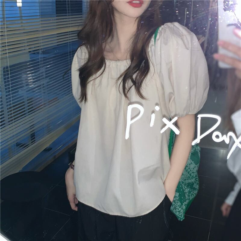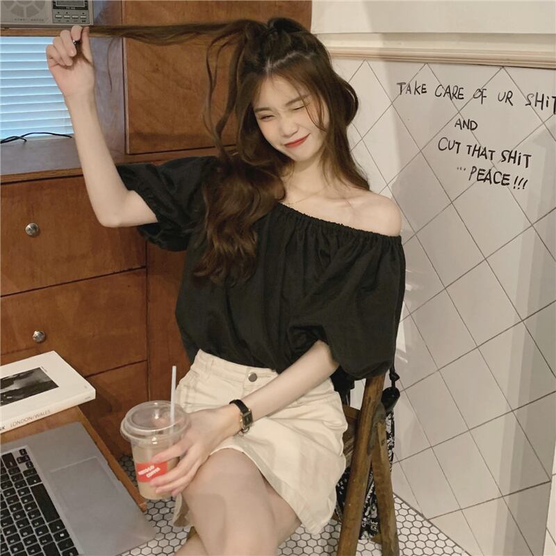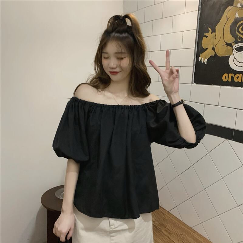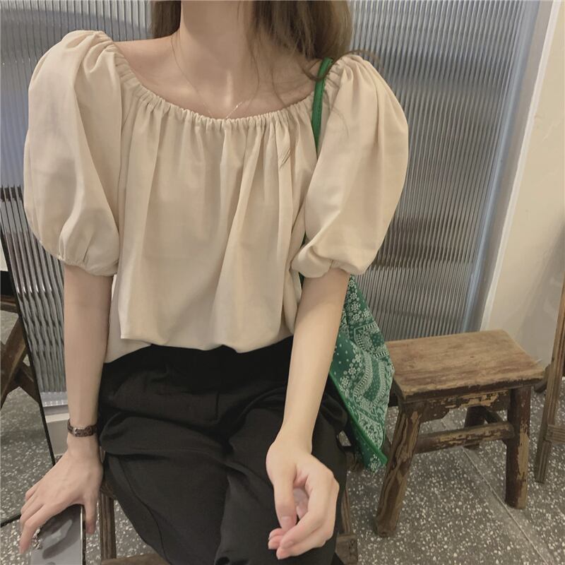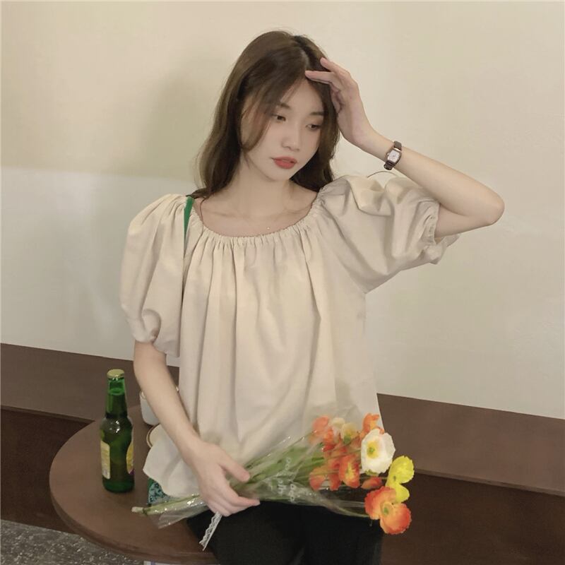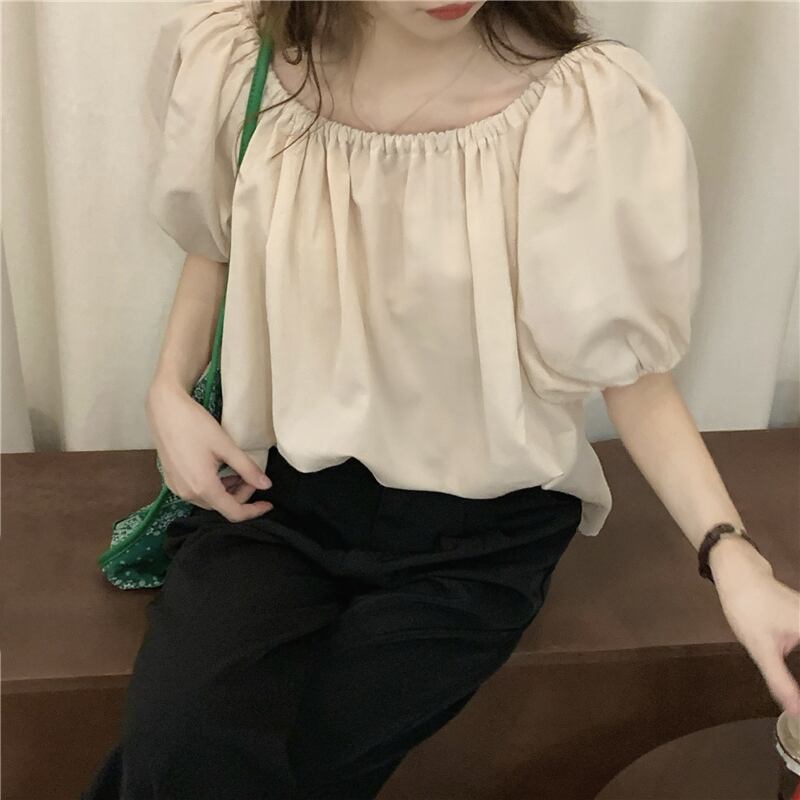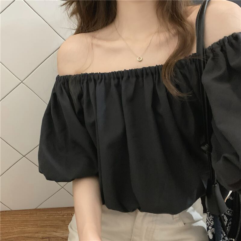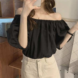 ブラウス トップス 襟なし 袖あり 半袖 パフスリーブ ラウンドネック オフショルダー ストレート かわいい カジュアル おしゃれ かっこいい お洒落 レトロ 大人可愛い ラブリー キュート 存在感 無地 春 夏 秋 冬 誕生日 母の日 パーティー 10代 20代 30代 40代 レディース 女性用 ママ 学生 通学 通勤 デート 公園デビュー ガーデン 着回し 普段使い 重ね着 お揃い 双子 韓国 コーデ 楽ちん ギフト フリーサイズ アプリコット ブラック