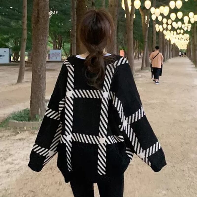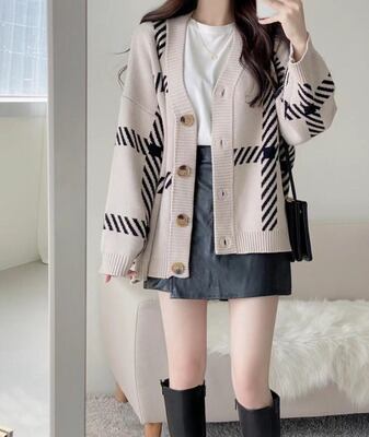 大きめのチェック柄が可愛いビッグシルエットのニットカーディガンです。