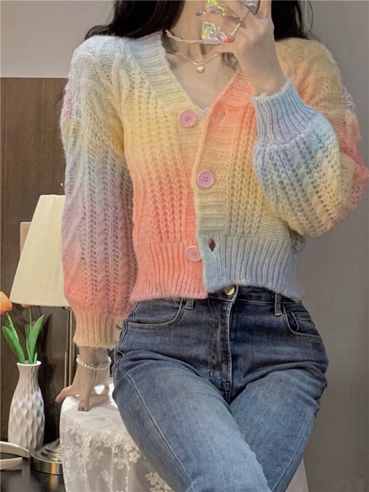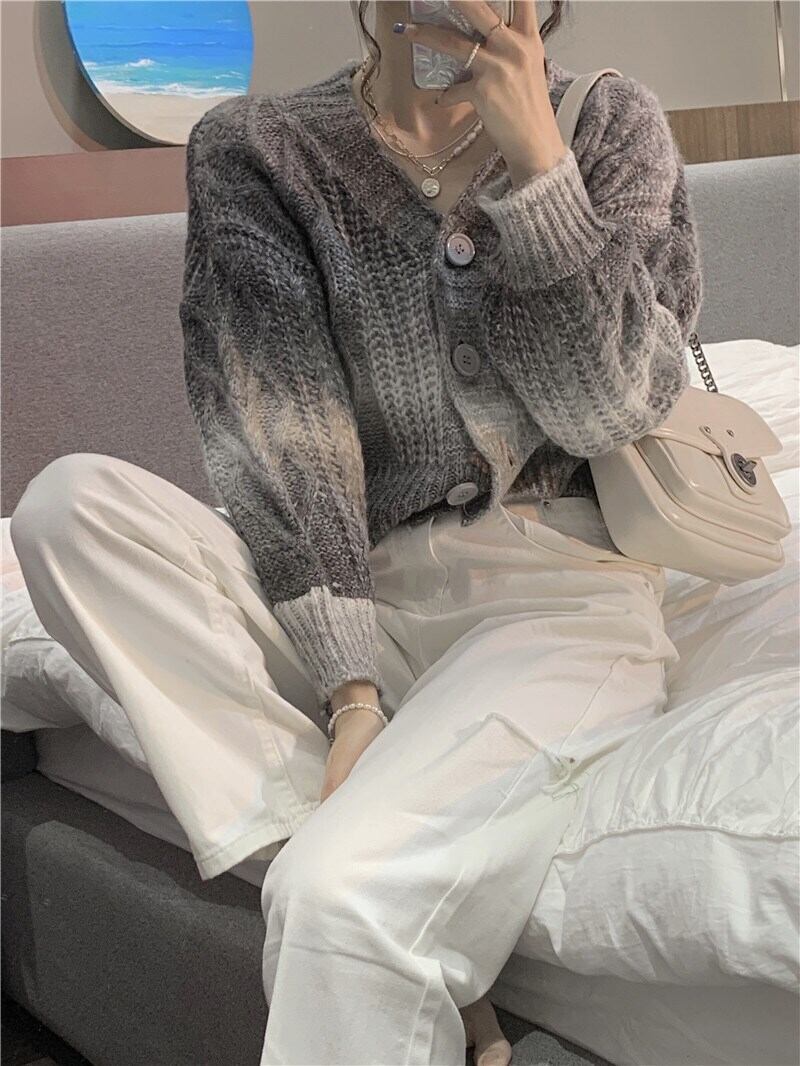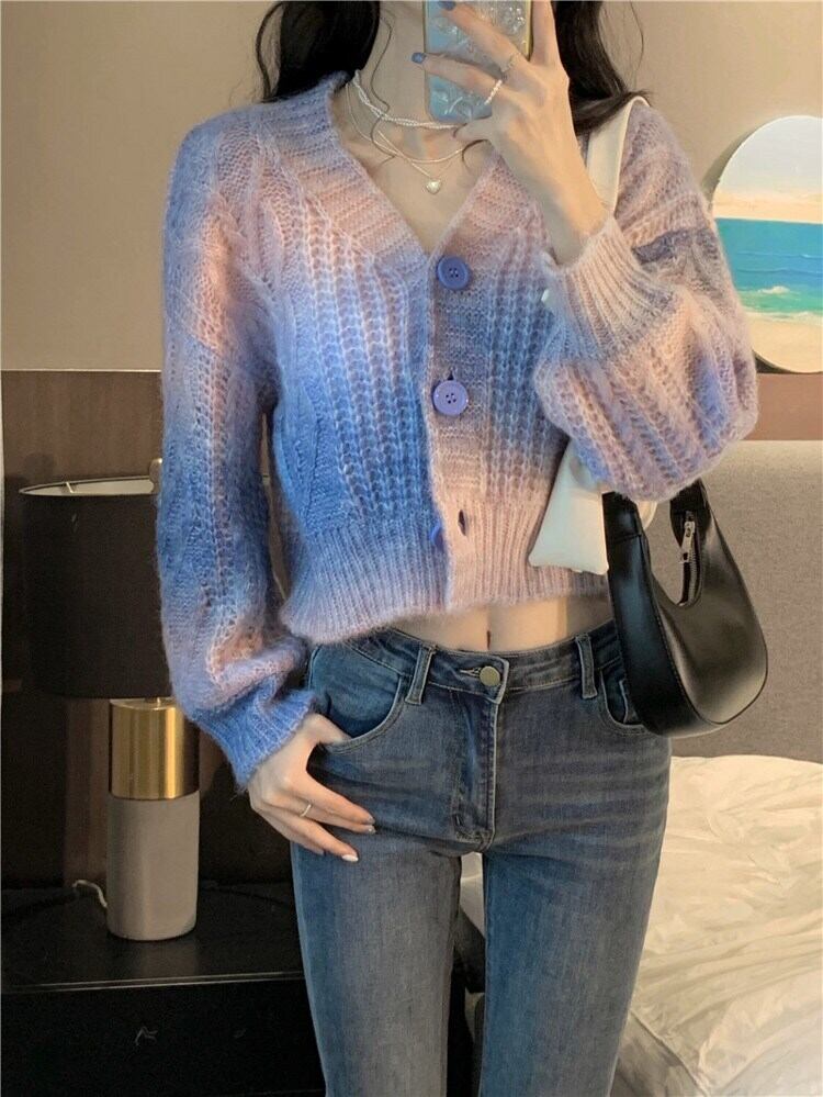 ニットカーディガントップス カーディガン 袖あり 長袖 Vネック 襟なし 短丈 ストレート もこもこ 前開き 2way かわいい カジュアル おしゃれ お洒落 レトロ 大人可愛い ラブリー キュート 主役級 グラデーション柄 春 秋 冬 誕生日 パーティー イベント 10代 20代 30代 女性用 学生 通学 デート ガーデン 着回し 普段使い 重ね着 お揃い 双子 韓国 コーデ 楽ちん 暖かい ギフト フリーサイズ グレー ピンク ブルー