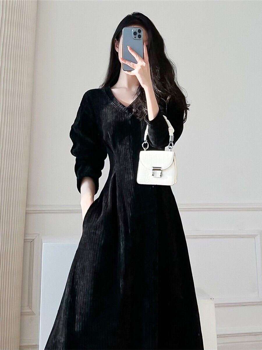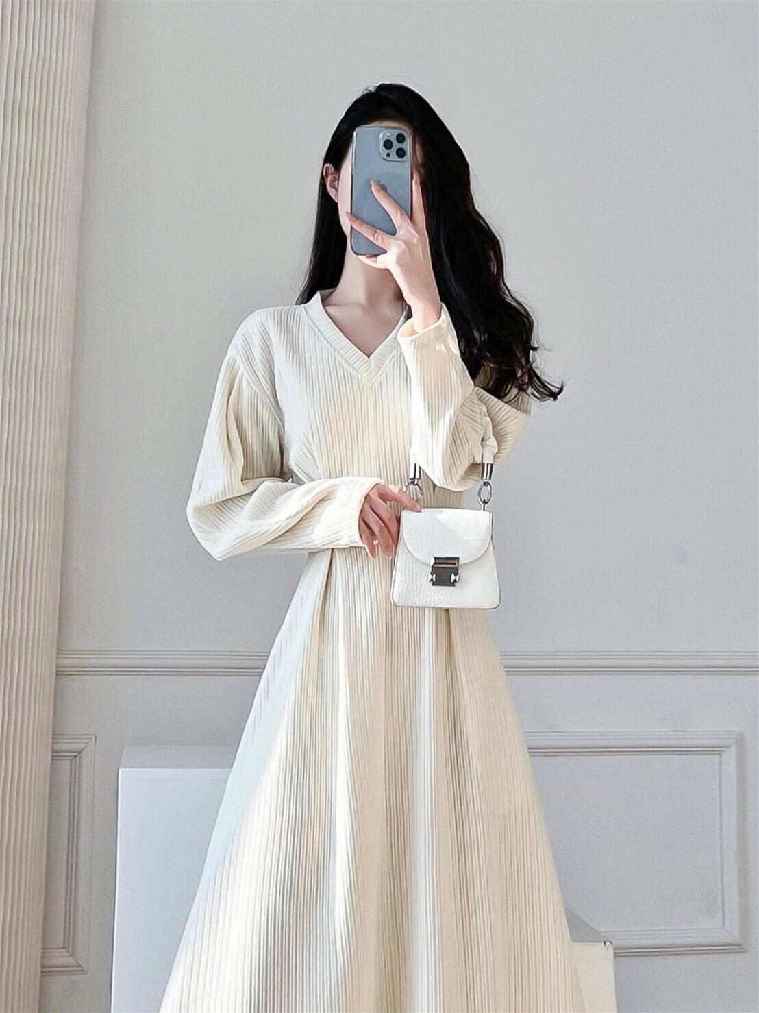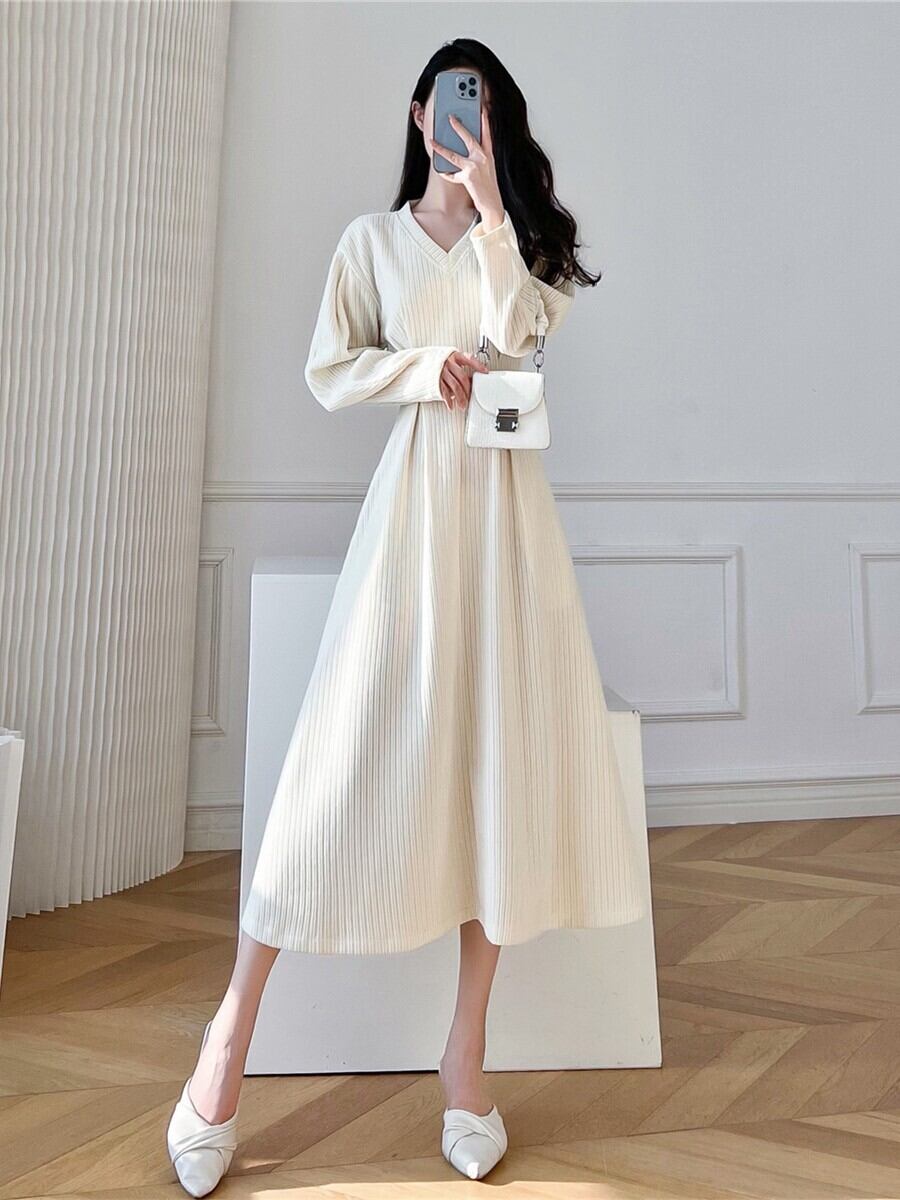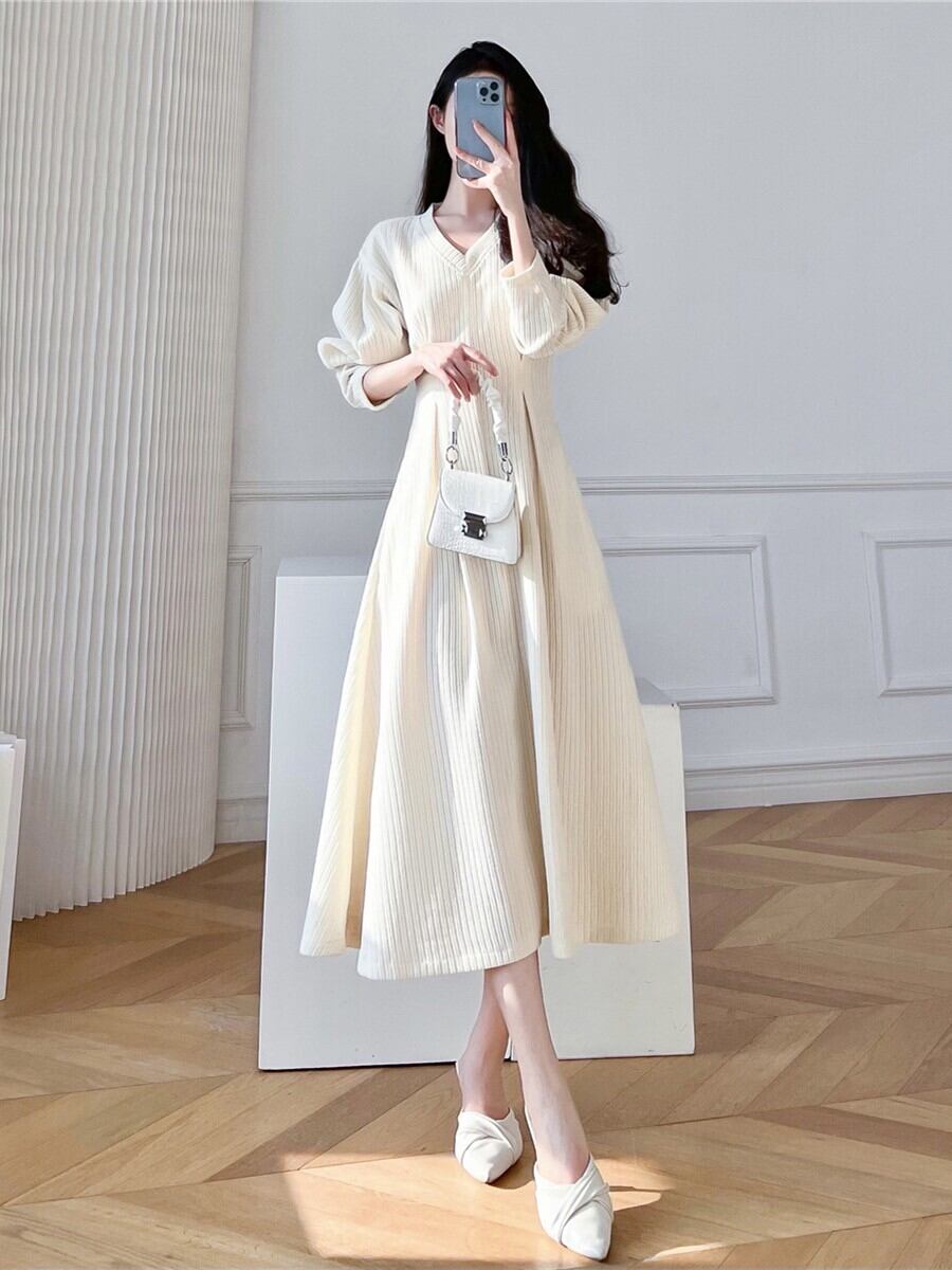 ワンピース フレンチワンピース ロング ロング丈 袖あり 7分袖 Vネック スリム 細身 Aライン 大人可愛い きれいめ シンプル カジュアル 大人 上品 おしゃれ レトロ 大人可愛い 大人女子 エレガント 主役級 存在感 無地 春 秋 誕生日 入学式 10代 20代 30代 40代 50代 60代 レディース ママ OL 学生 デート お泊まり 休日 イベント 旅行 普段使い 韓国 韓国系 楽ちん モテ S M L XL 2XL 白 ホワイト 黒 ブラック