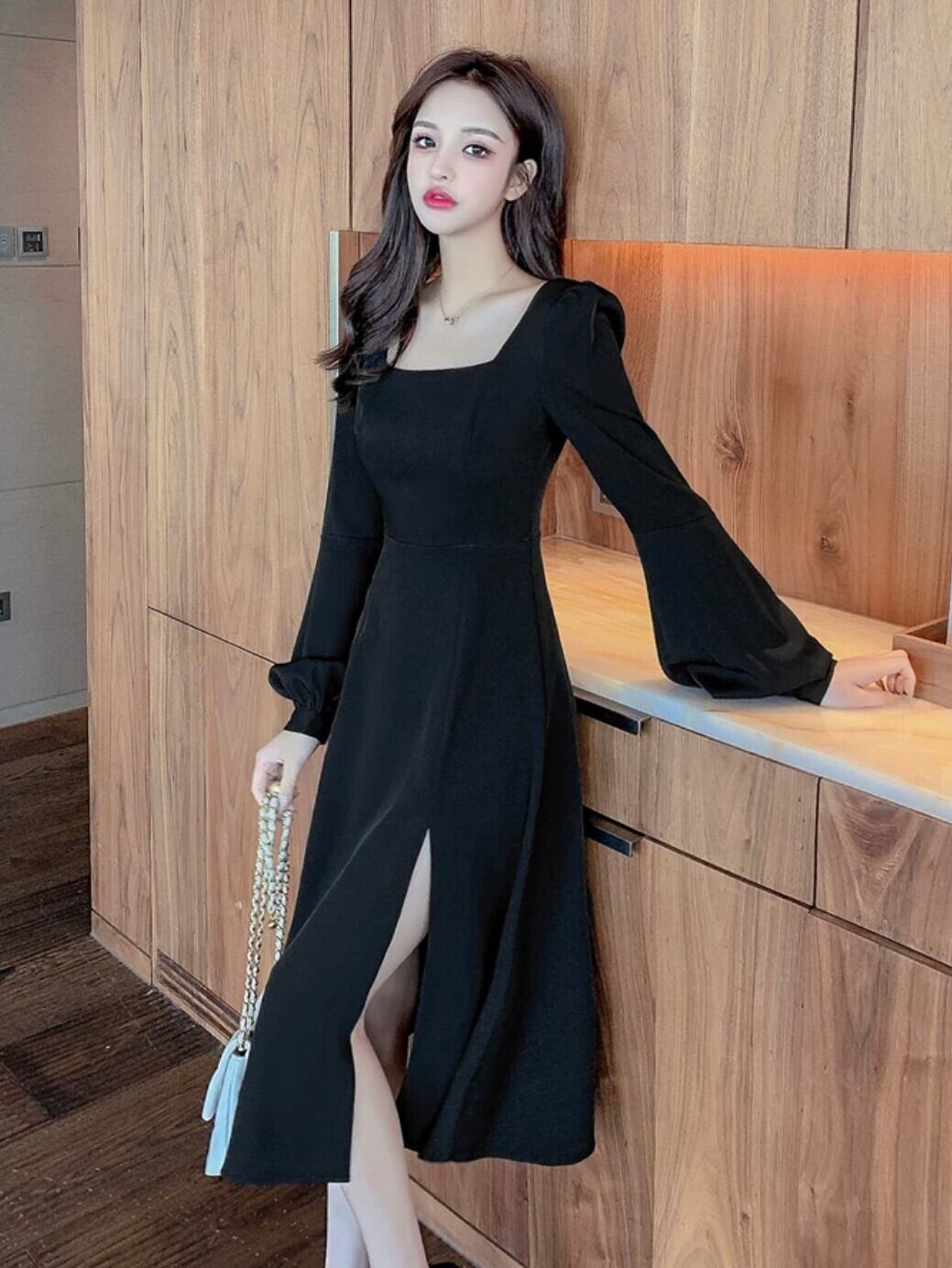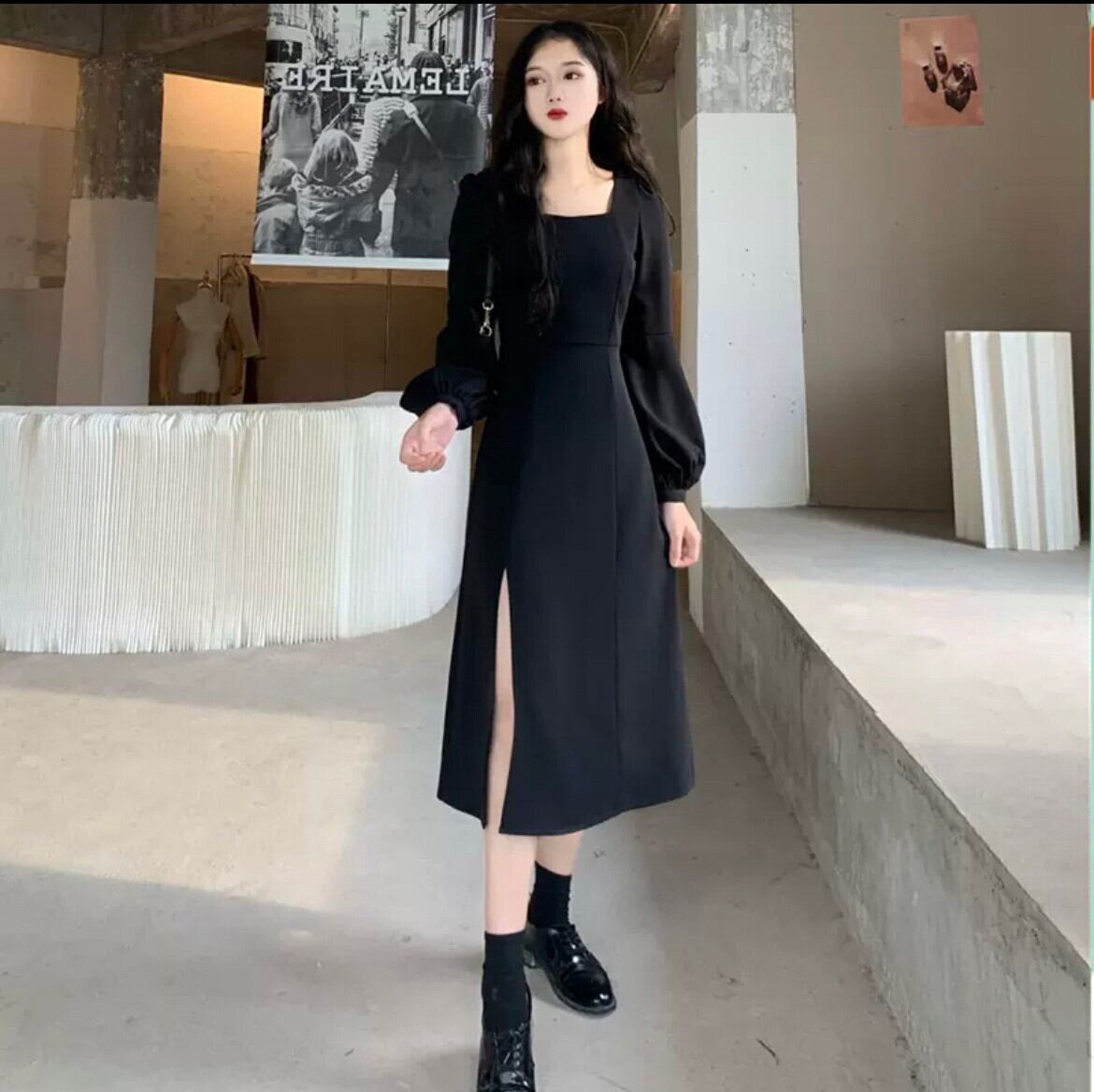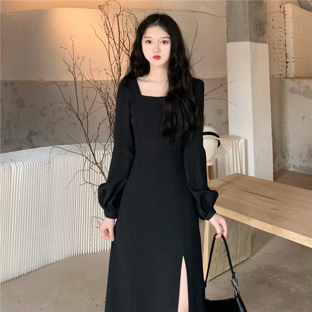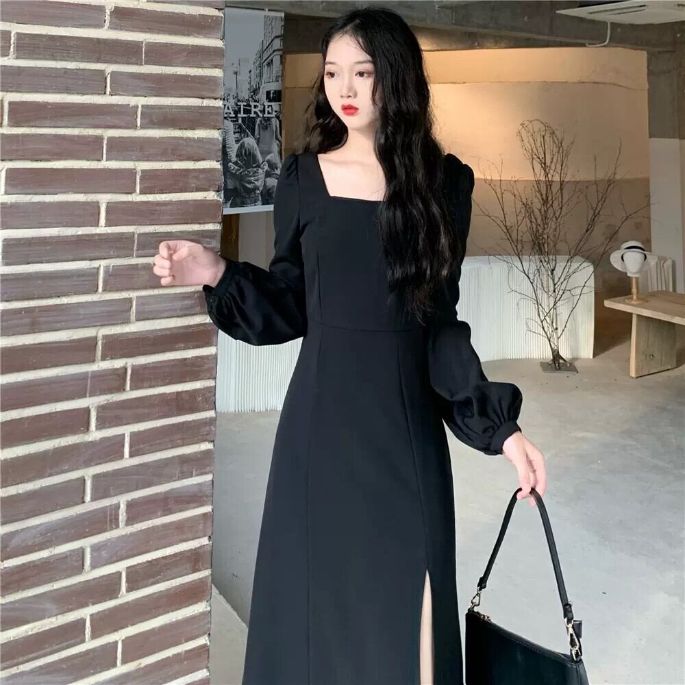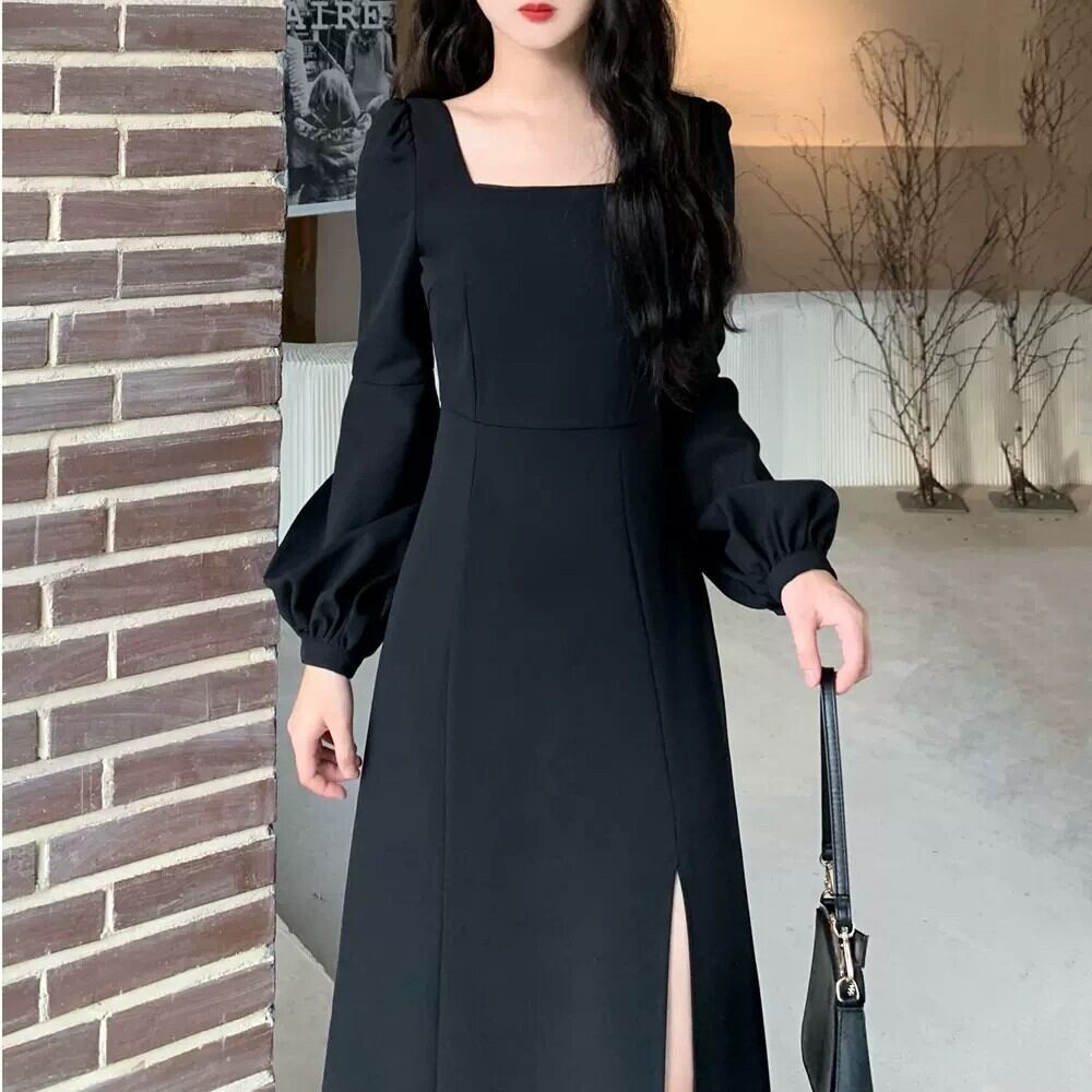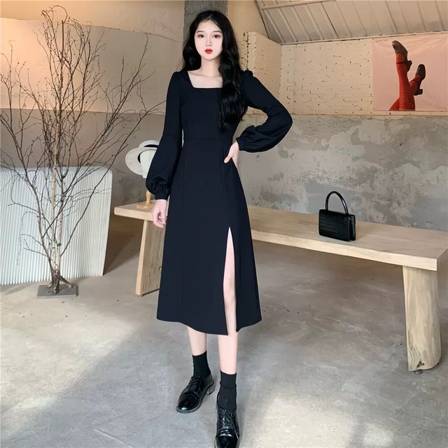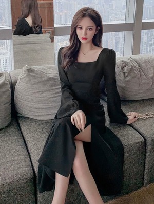 ワンピース ロング ロング丈 袖あり 長袖 スクエアネック Aライン スリット 大人可愛い きれいめ シンプル カジュアル 大人 上品 おしゃれ レトロ 大人可愛い 大人女子 セクシー エレガント 主役級 存在感 無地 秋 冬 二次会 10代 20代 30代 40代 50代 レディース ママ OL 学生 デート お泊まり 休日 イベント 旅行 ホテル レストラン 普段使い 韓国 韓国系 楽ちん モテ インスタ映え 高級感 サイズ M L XL 2XL 3XL 4XL カラー展開 黒 ブラック