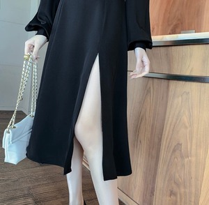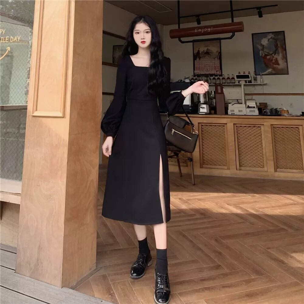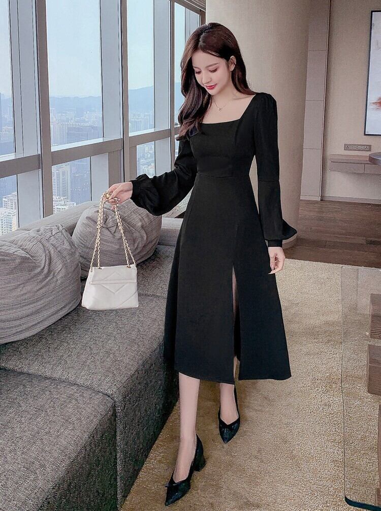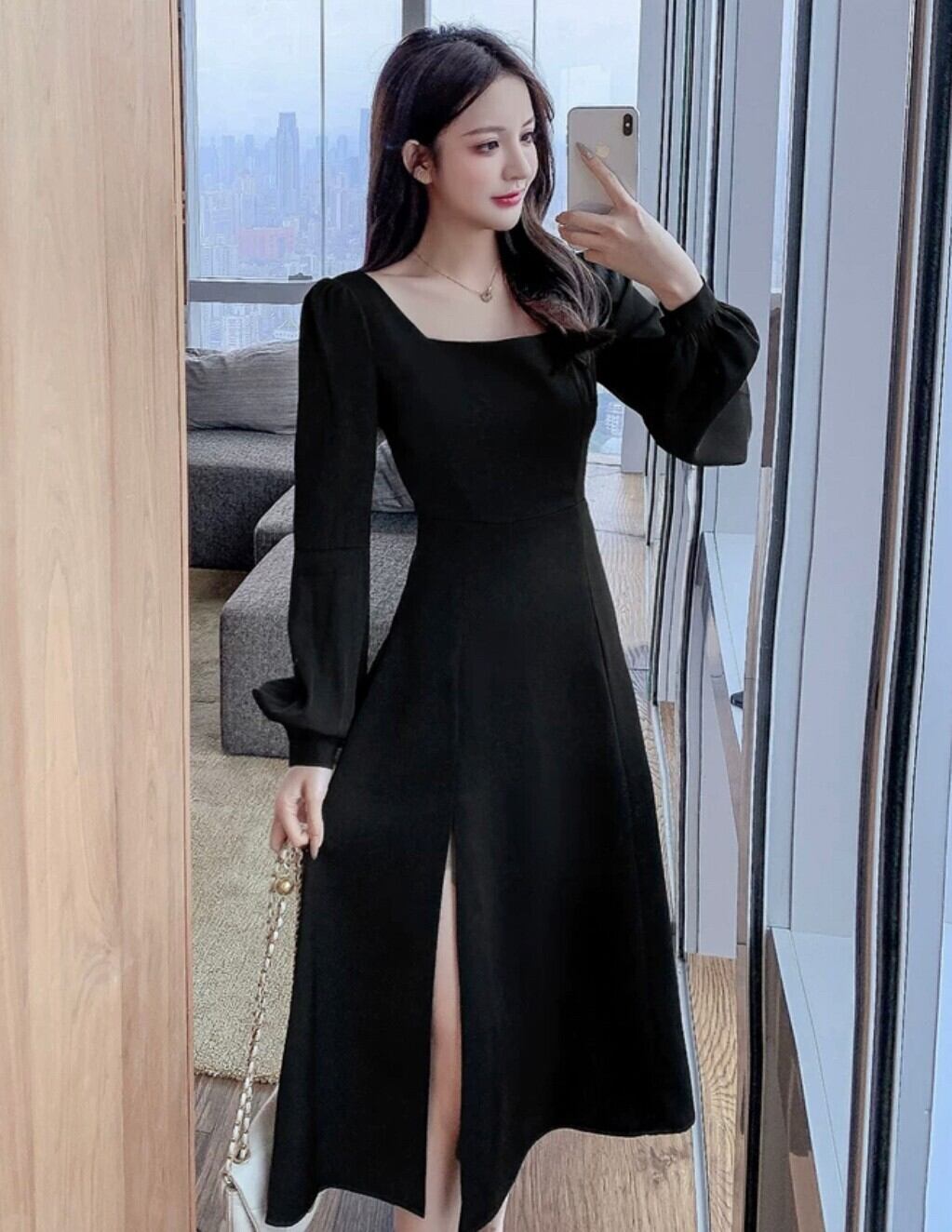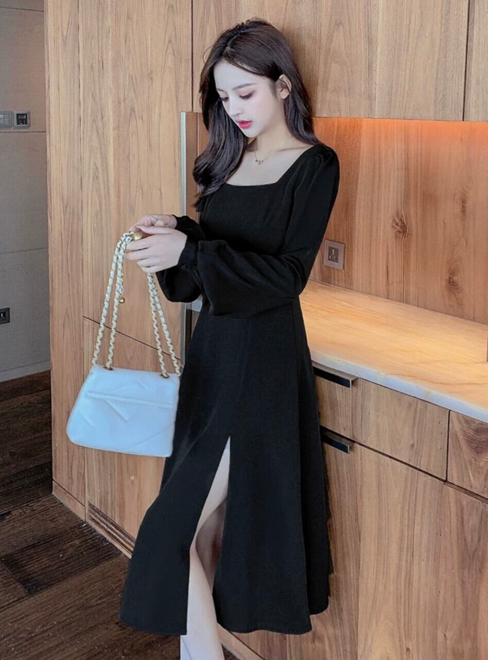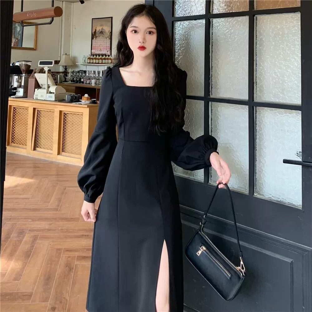 ワンピース ロング ロング丈 袖あり 長袖 スクエアネック Aライン スリット 大人可愛い きれいめ シンプル カジュアル 大人 上品 おしゃれ レトロ 大人可愛い 大人女子 セクシー エレガント 主役級 存在感 無地 秋 冬 二次会 10代 20代 30代 40代 50代 レディース ママ OL 学生 デート お泊まり 休日 イベント 旅行 ホテル レストラン 普段使い 韓国 韓国系 楽ちん モテ インスタ映え 高級感 サイズ M L XL 2XL 3XL 4XL カラー展開 黒 ブラック