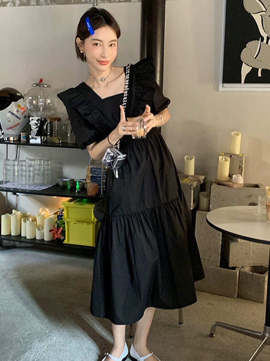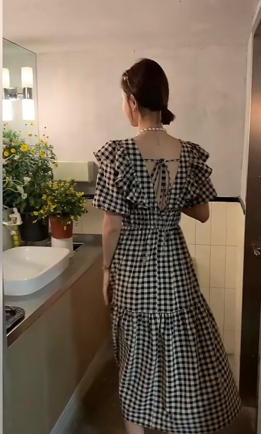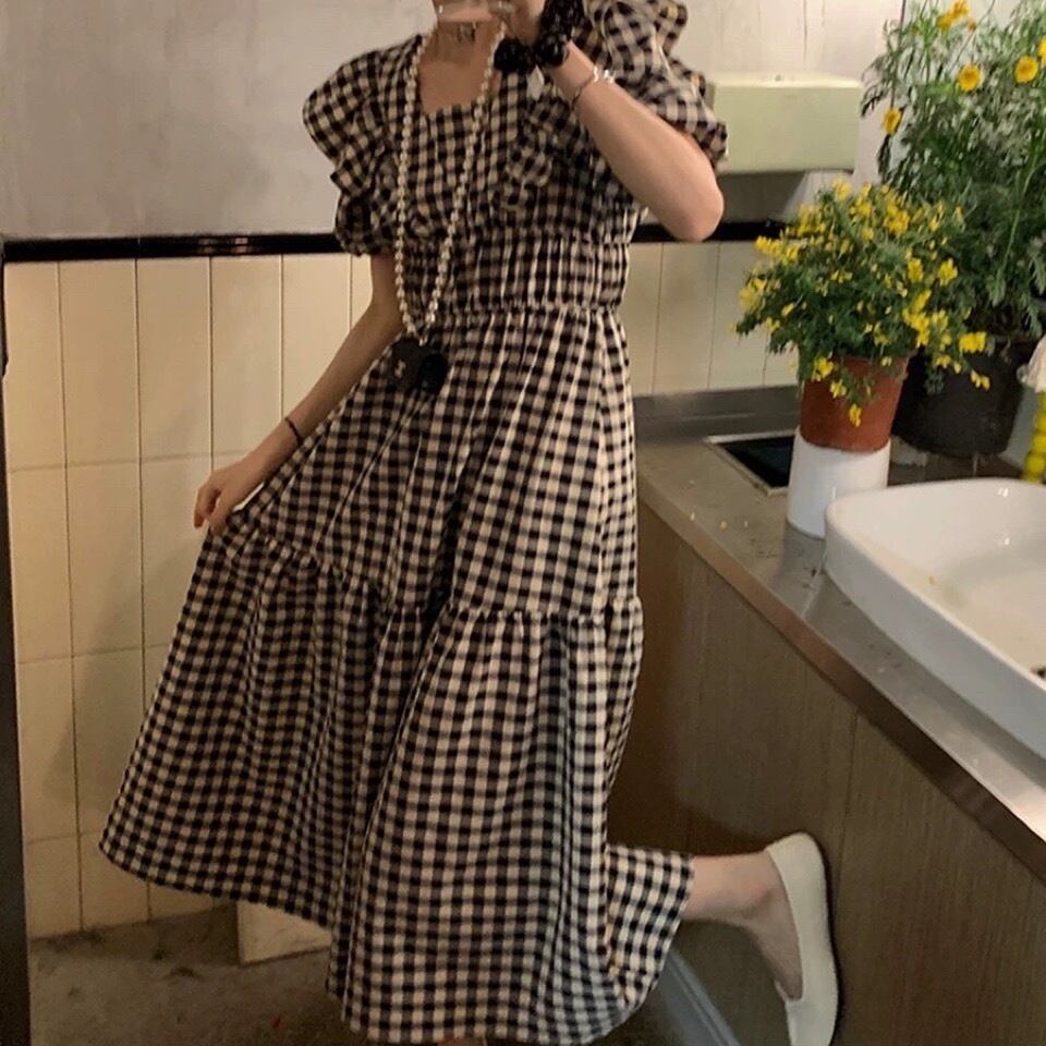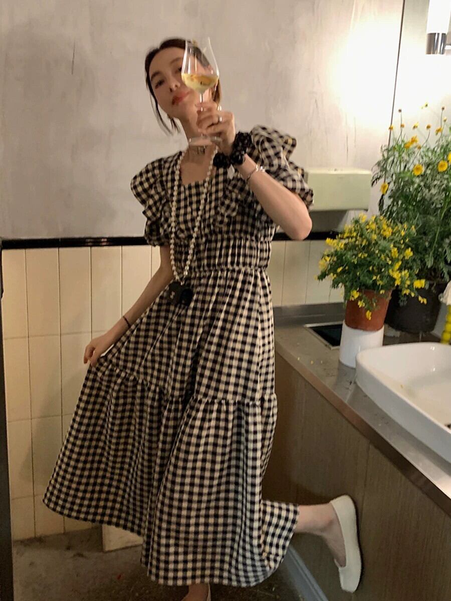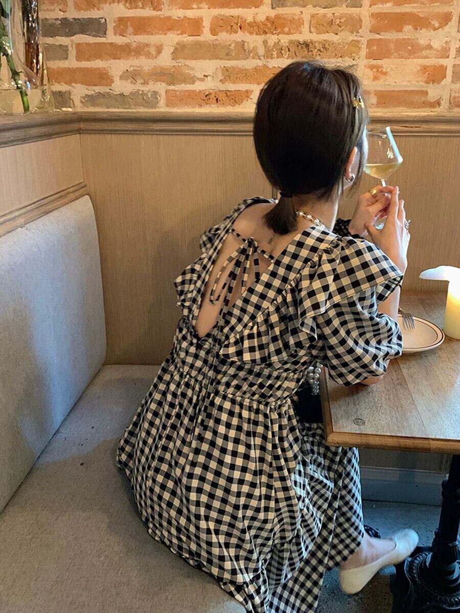 ワンピース チェックワンピース ロング ロング丈 半袖 Aライン フリル バックリボン かわいい 大人可愛い シンプル おしゃれ レトロ 大人可愛い 大人女子 キュート ガーリー モード系 エレガント 存在感 無地 チェック柄 春 夏 10代 20代 30代 40代 レディース 女性用 ママ 学生 デート 女子会 お泊まり 休日 アウトドア イベント リゾート 旅行 海 韓国 韓国系 コーデ スタイル 楽ちん モテ 脚長 プレゼント ギフト インスタ映え M L XL 2XL 黒 ブラック チェック