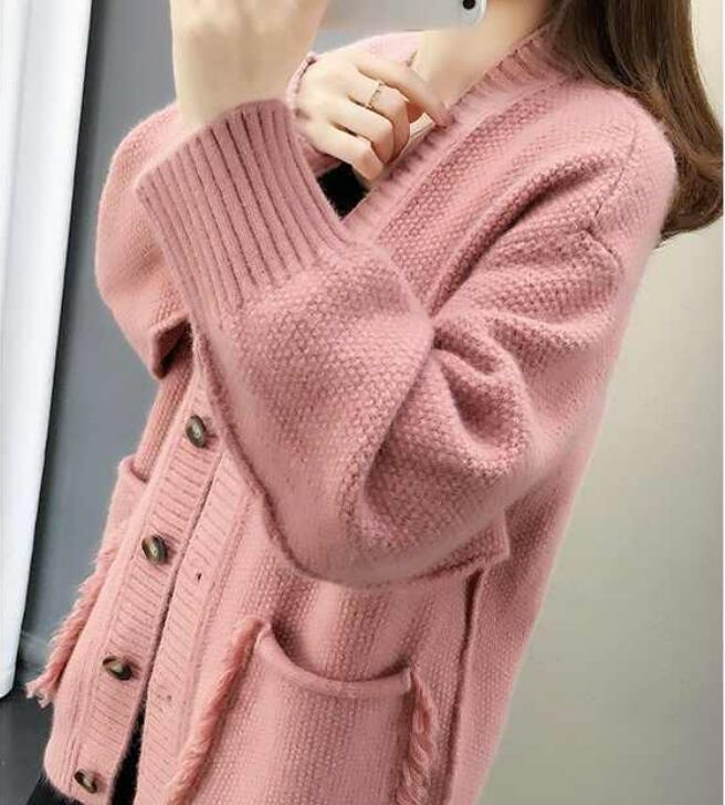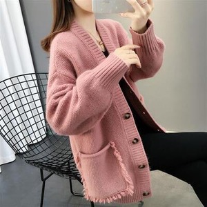 大きめポケットのフリンジが特徴のニットカーディガンです。