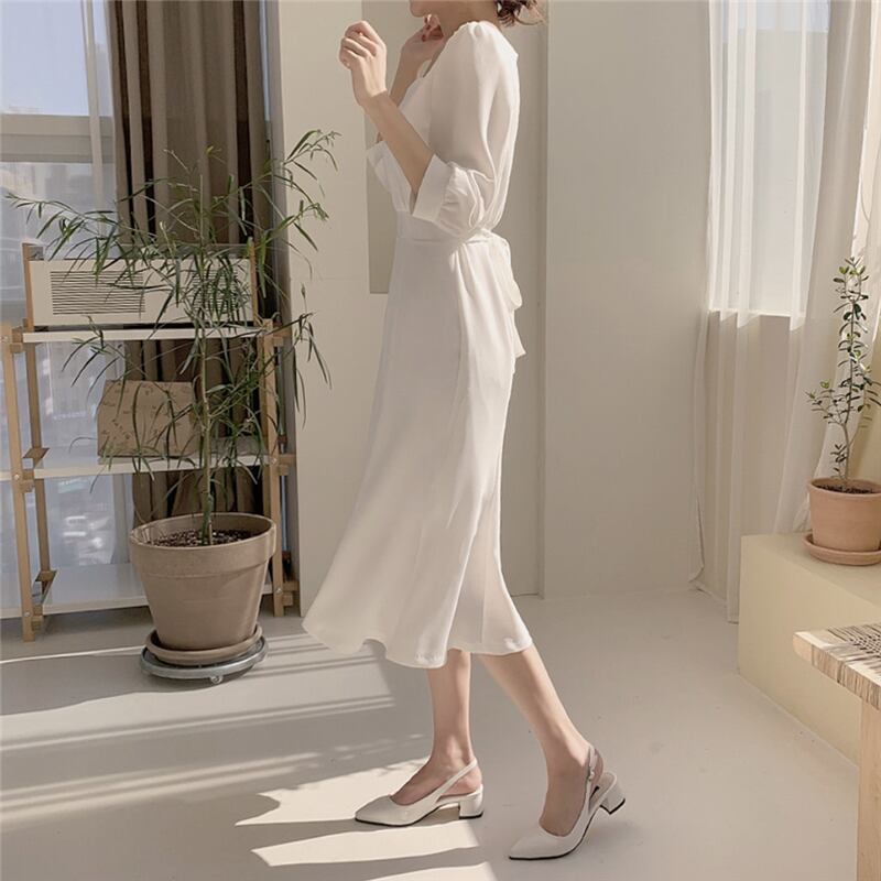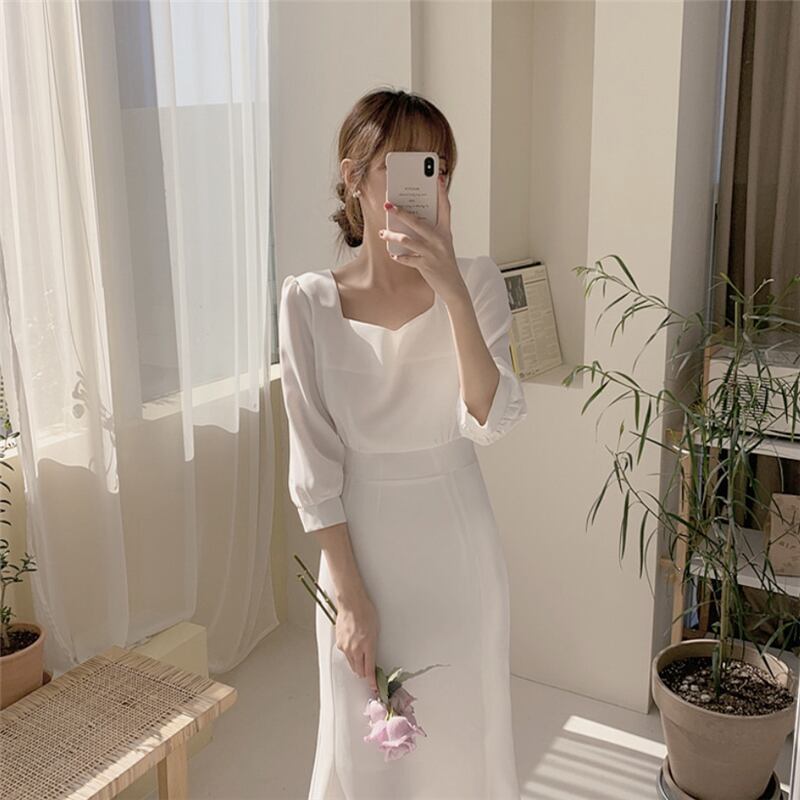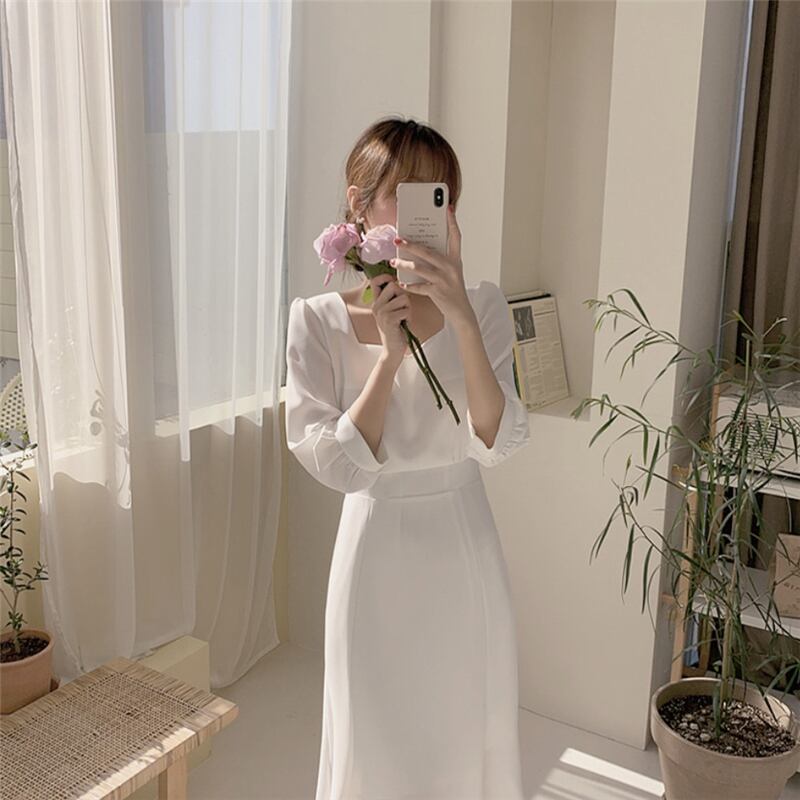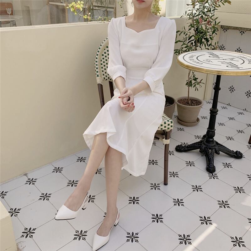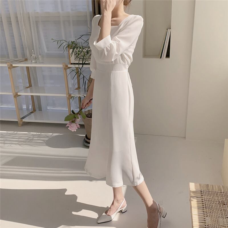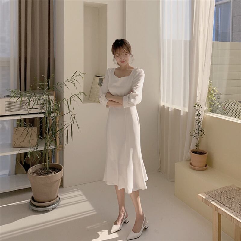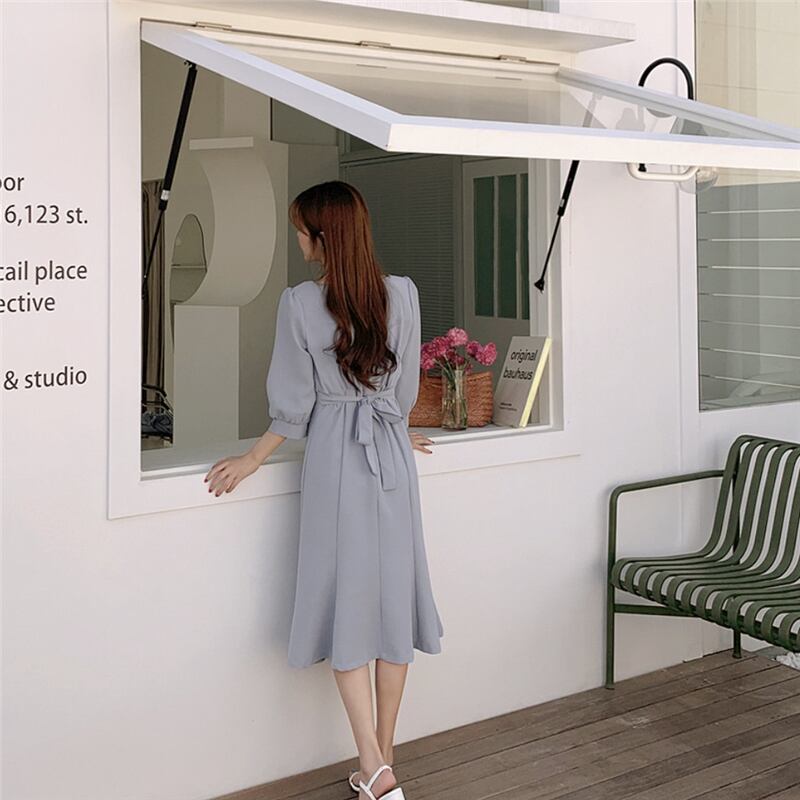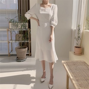 ドレスワンピース パーティードレス 膝丈ドレス 舞台衣装 フレアワンピース ダンス衣装 膝下 袖あり 襟なし 七分袖 ペンタゴンネック プリンセスライン スリム 細身 フレア リボン かわいい 大人可愛い きれいめ 大人 おしゃれ お洒落 エレガント 無地 10代 20代 30代 40代 レディース 女性用 デート お出かけ 女子会 インスタ映え 春 秋 冬 結婚式 2次会1.5次会 パーティ クリスマス S M L XL ホワイト ブルー