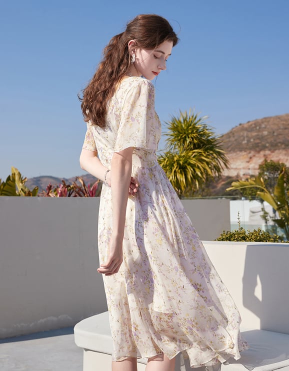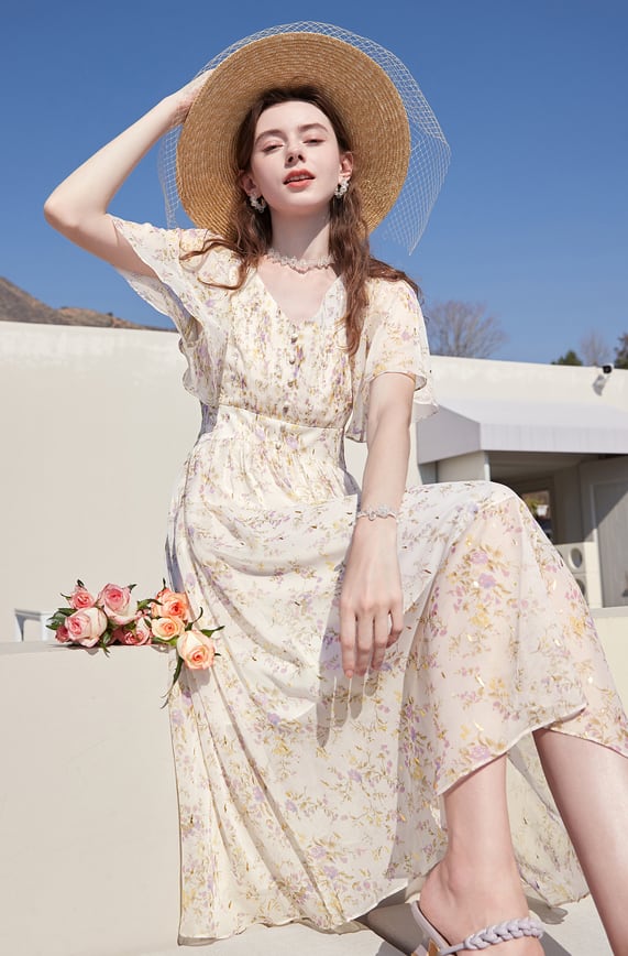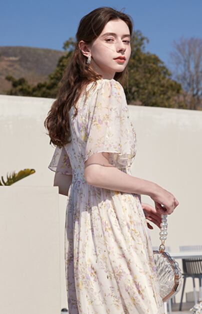 花柄ワンピース 膝下 舞台衣装 Aラインドレス ワンピースドレス ミモレ丈 袖あり 半袖 襟なし Vネック Aライン 細身 チュール かわいい 大人 おしゃれ お洒落 大人可愛い エレガント 花柄 10代 20代 30代 レディース 女性用 デート お出かけ 女子会 誕生日 海 ビーチ インスタ映え 春 夏 秋 冬 1.5次会 パーティ 撮影 S M ホワイト
