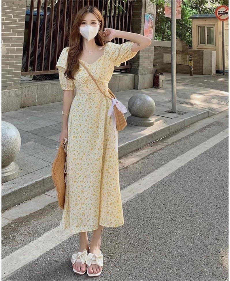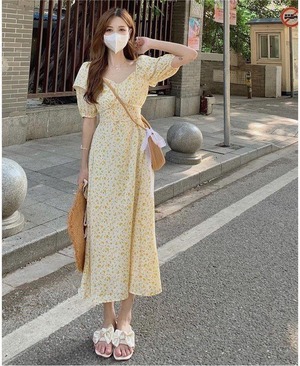 お花柄の半袖ワンピース。