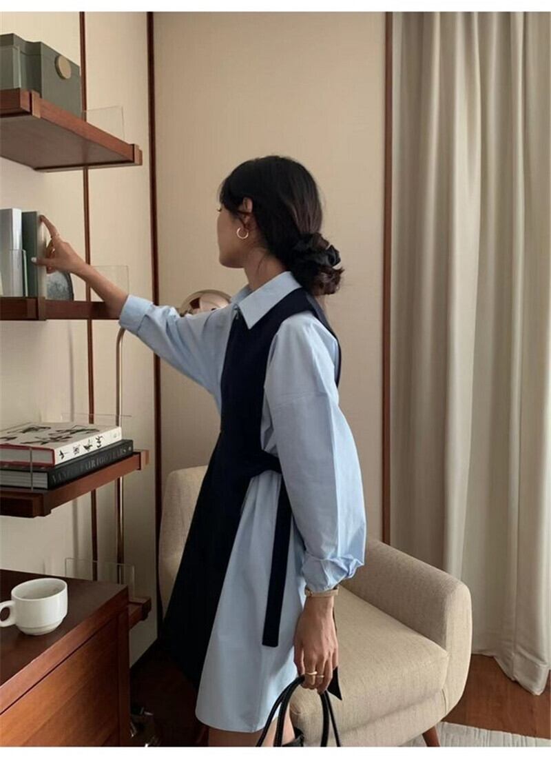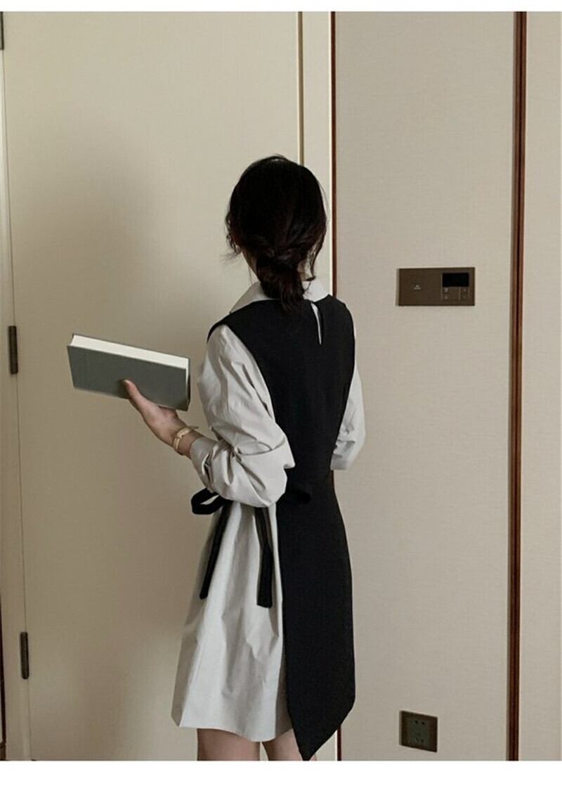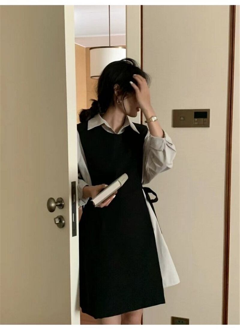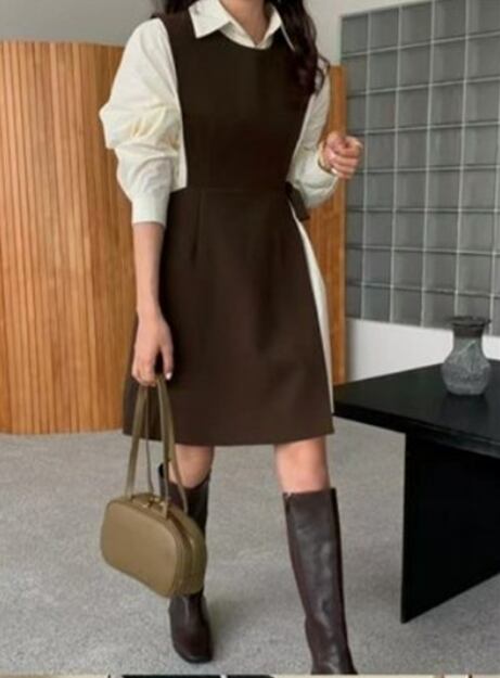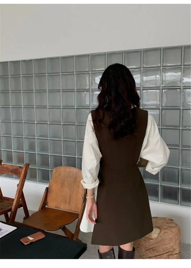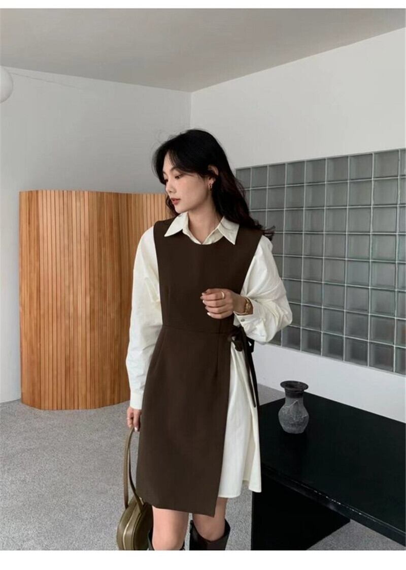 2ピースセットワンピース ひざ上スカート ショート丈 袖あり 長袖 襟付き スリム 細身 2way ツーピース きれいめ シンプル 上品 おしゃれ かっこいい 大人女子 マニッシュ フォーマル 無地 春 夏 秋 冬 20代 30代 レディース 女の子 ビジネス OL 通勤 通学 学校 制服 パーティー イベント 着回し 重ね着 韓国 韓国系 フリーサイズ ブラウン ブラック ブルー