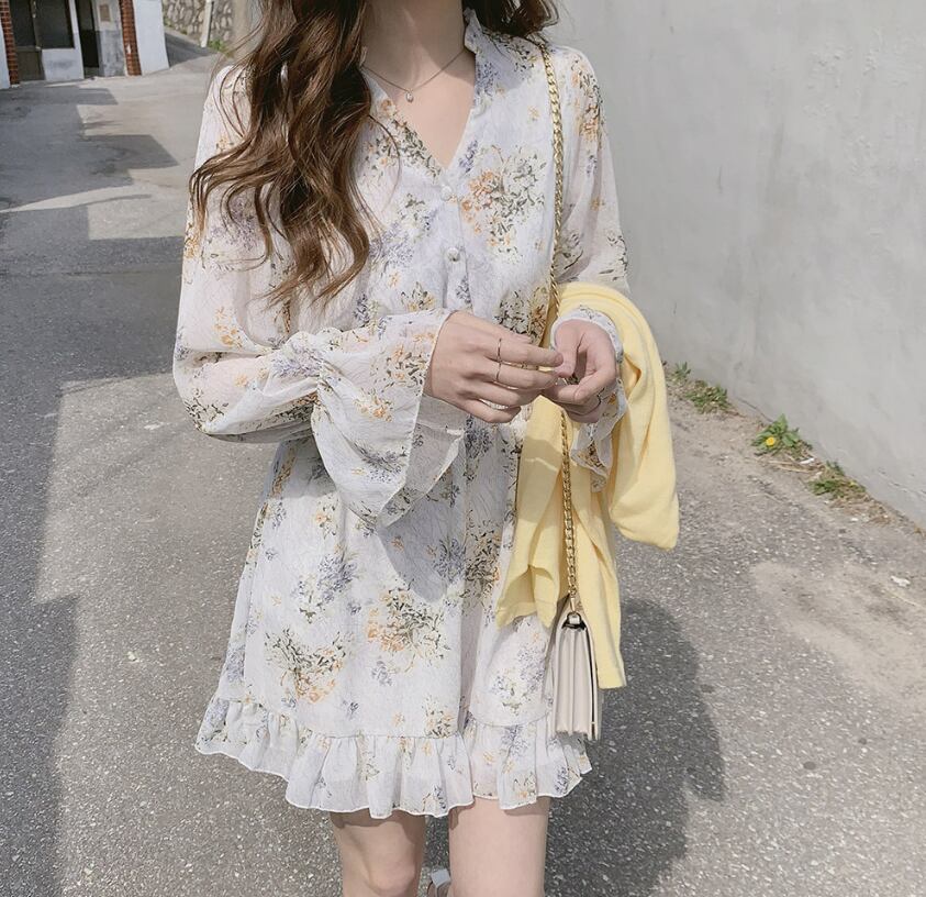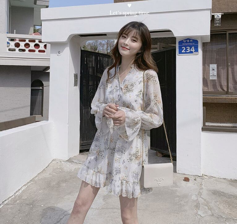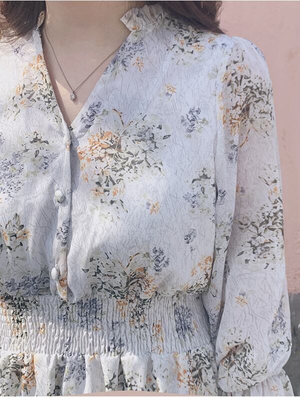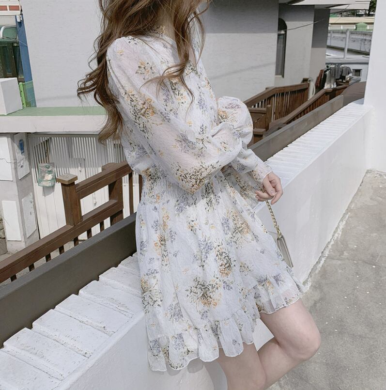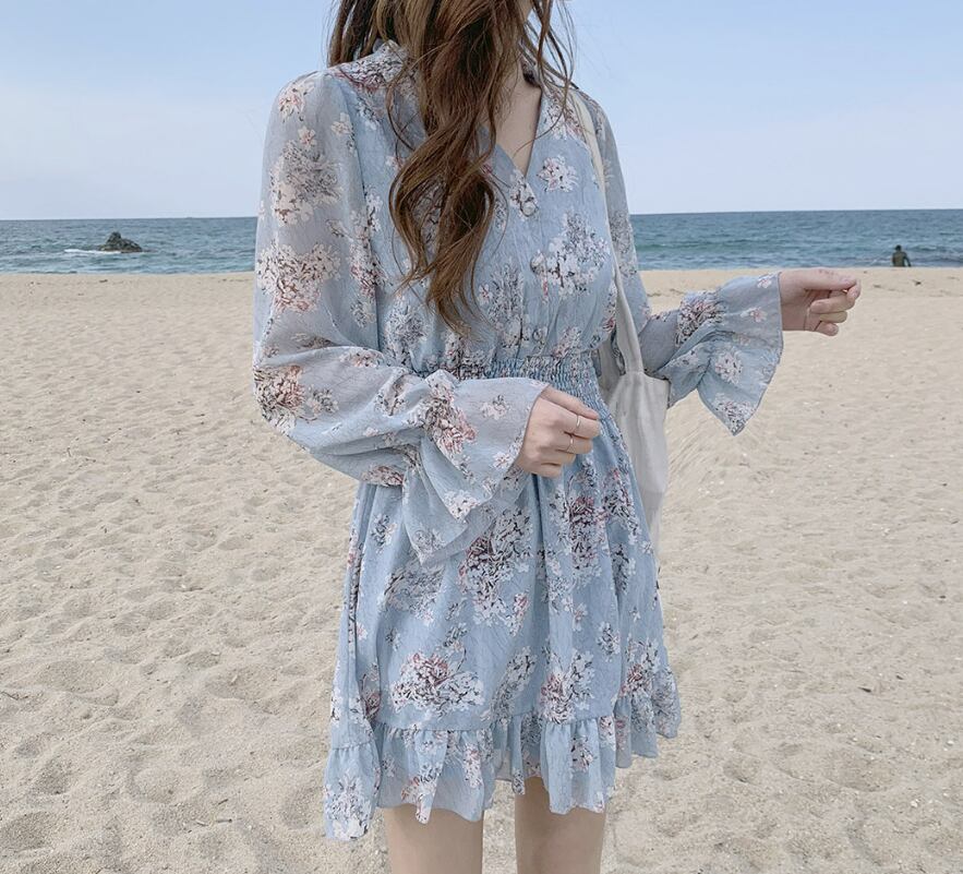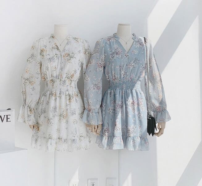 花柄ワンピース ミニスカート フリルスカート ミニ ミニ丈 ショート 膝上 袖あり 長袖 Vネック 襟なし 細身 スマート かわいい 大人 カジュアル 大人 おしゃれ お洒落 キュート 大人可愛い 花柄 春 夏 秋 冬10代 20代 レディース 女性用 女の子 学生 通学 デート お出かけ 女子会 お泊まり 休日 イベント リゾート 旅行 海 プール 着回し 普段使い お揃い 韓国 韓国系 ファッション 楽ちん S M L XL ホワイト ブルー