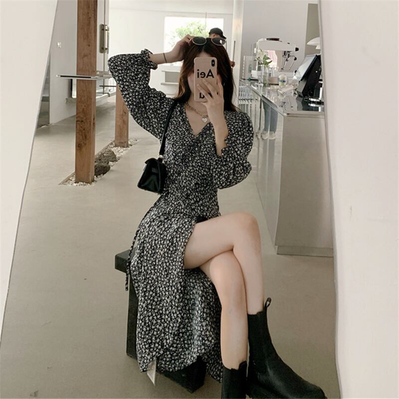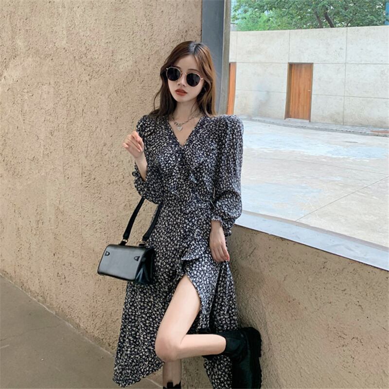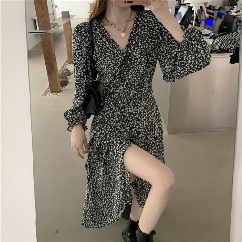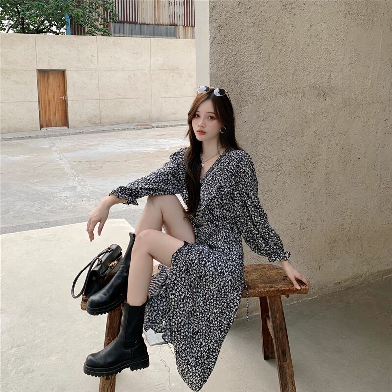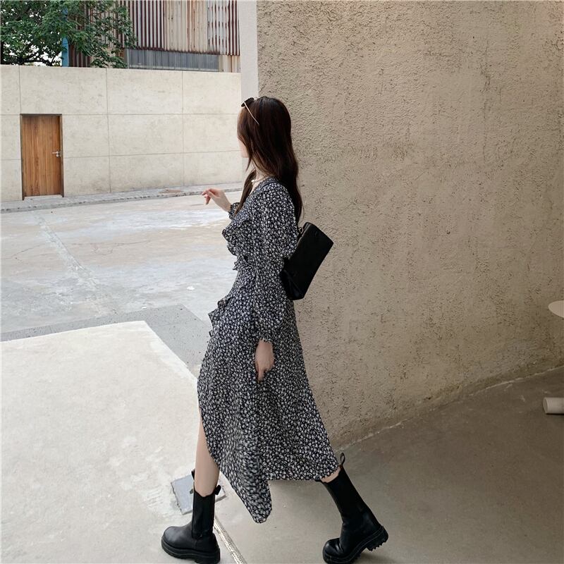 花柄ワンピース 膝下スカート 膝下丈 袖あり 長袖 Vネック スリム ストレート スマート フリル ウエスト調節 かわいい 大人可愛い カジュアル 大人 おしゃれ お洒落 大人 花柄 春 夏 秋 冬10代 20代 30代 レディース 女性用 女の子 学生 通学 デート お出かけ 女子会 お泊まり 休日 イベント リゾート 旅行 海 プール 着回し 普段使い お揃い 韓国 韓国系 ファッション 楽ちん S M L 花柄