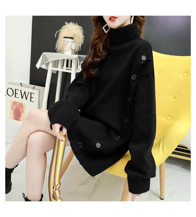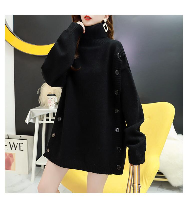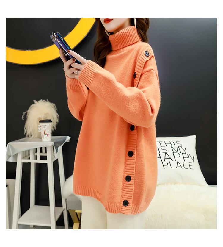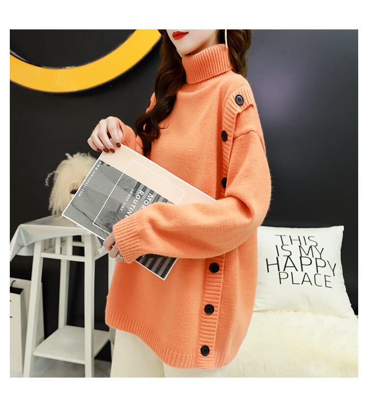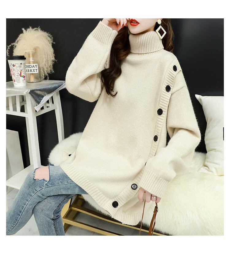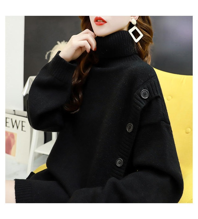 サイドの大きなボタンがアクセントのタートルネックニット。
