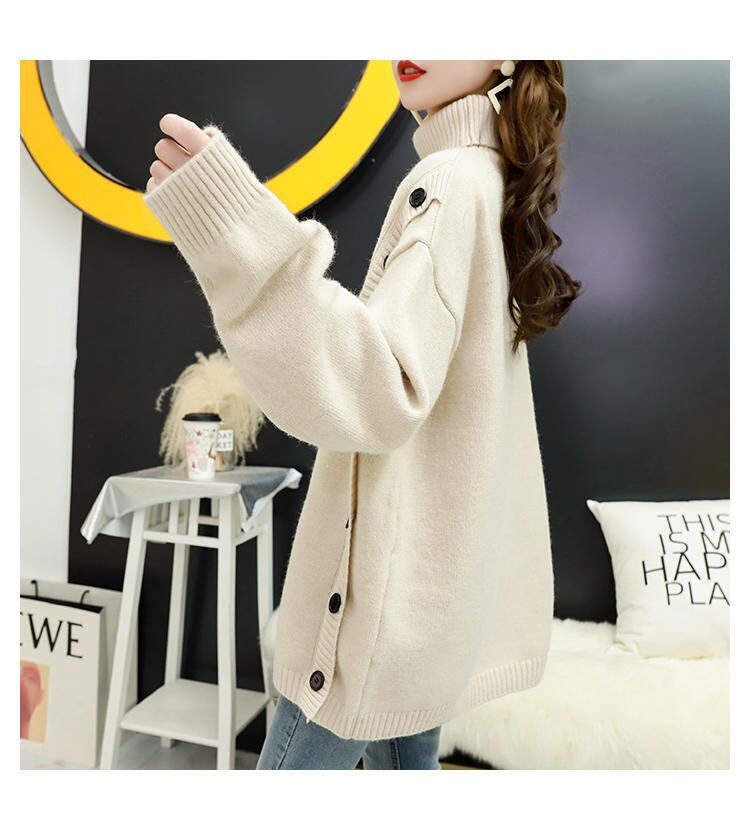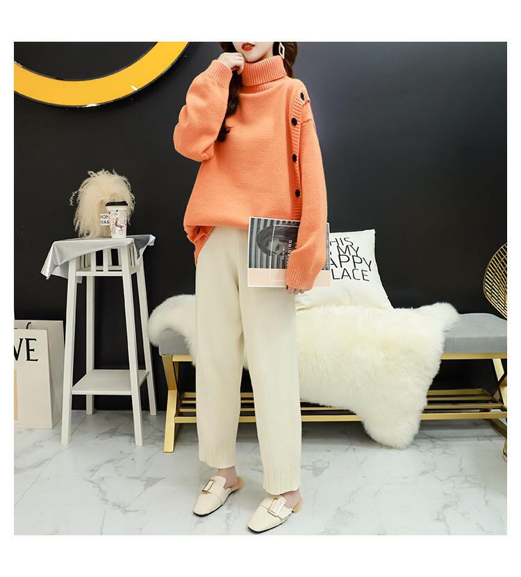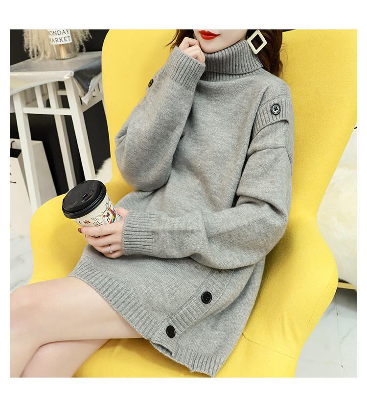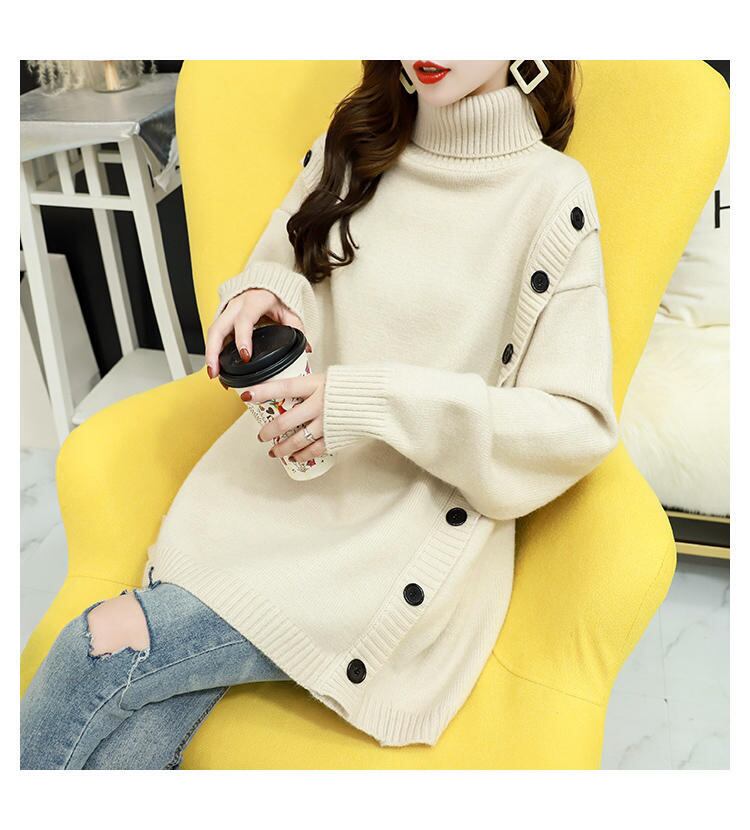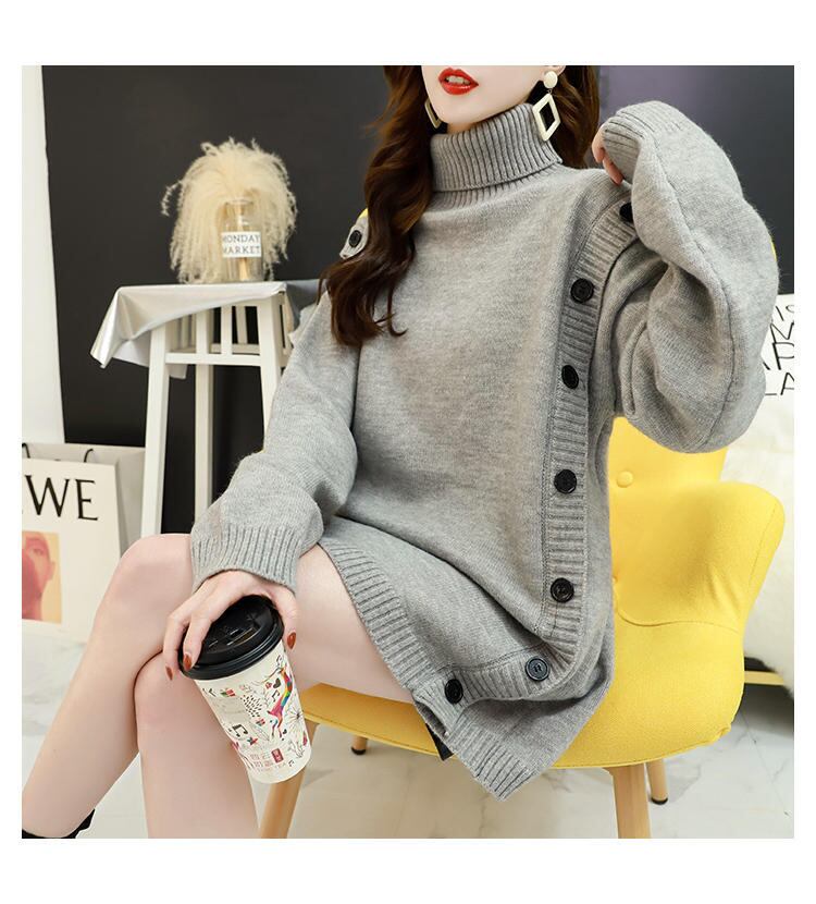 サイドの大きなボタンがアクセントのタートルネックニット。