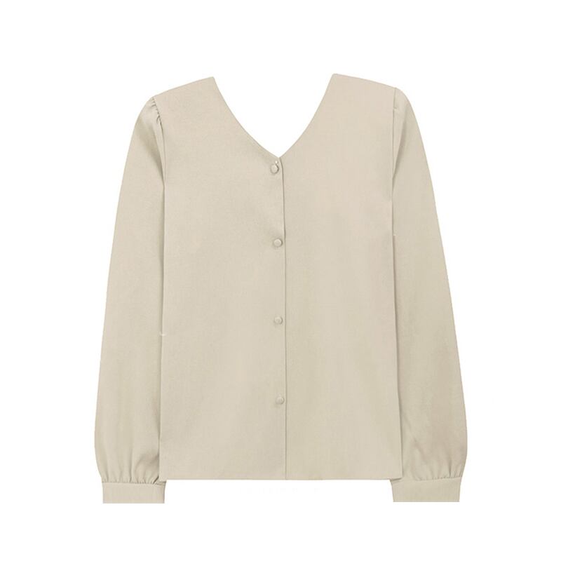 さらりとした生地感で肌触りの良いシンプルなVネックシャツブラウス。