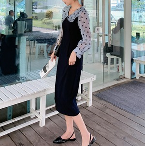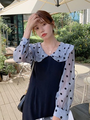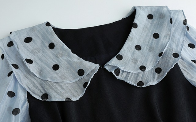 大きめのカラーにドット柄のラブリーなワンピースです。