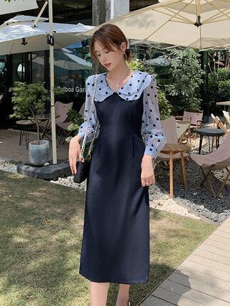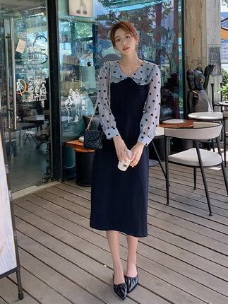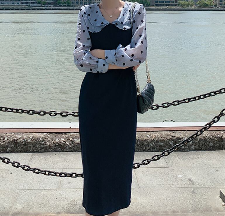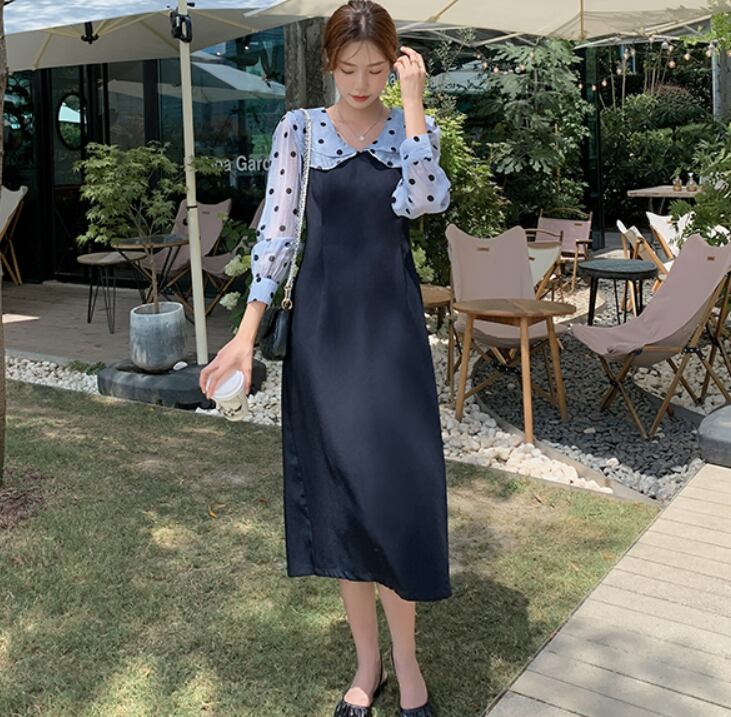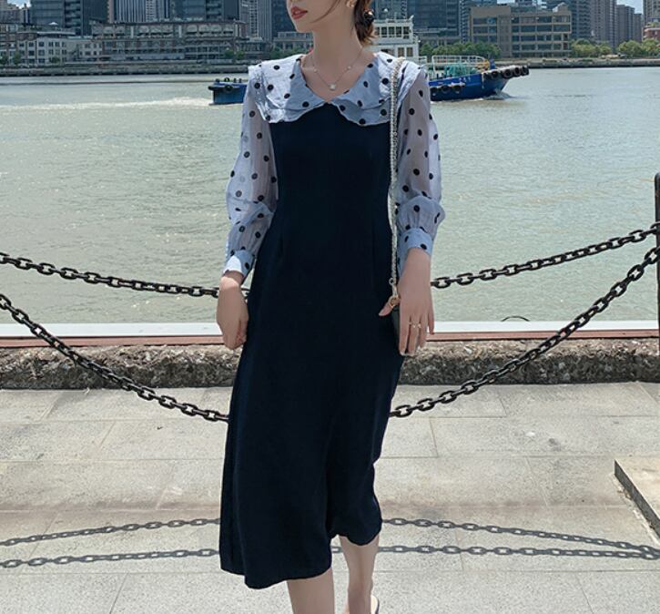 ワンピース 膝下スカート 膝下スカート 長袖 ラウンドネックスリム 細身 ストレート スマート かわいい 大人可愛い シンプル カジュアル 大人 おしゃれ お洒落 キュート ガーリー ラブリー 無地 ドット柄 春 夏 秋 冬10代 20代 30代 レディース 女性用 女の子 学生 通学 デート お出かけ 女子会 休日 イベント リゾート 旅行 ガーデン 着回し 普段使い お揃い 韓国 韓国系 ファッション S MLXL2XL ブルー