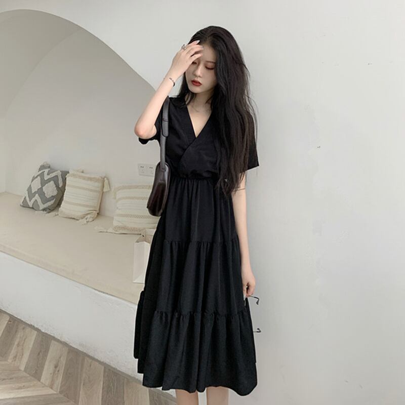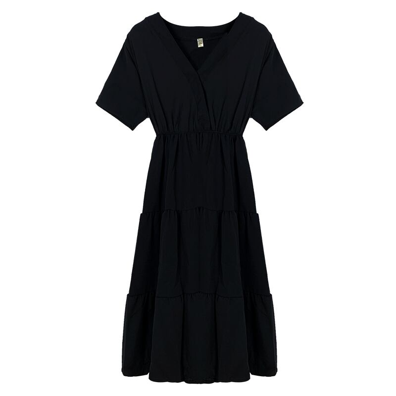 ワンピース 膝丈ドレス ひざ丈 膝下 袖あり 半袖 Vネック スリム ハイウエスト かわいい 大人可愛い シンプル カジュアル 上品 おしゃれ お洒落 かっこいい 大人女子 こなれ感 ラフ クール 主役級 無地 10代 20代 30代 レディース ママ 学生 通学 デート お出かけ 女子会 休日 高原 ガーデン 体系カバー インスタ映え 春 夏 秋 冬 パーティ サイズ M L XL 2XL 3XL 4XL 大きいサイズ 黒 ブラック