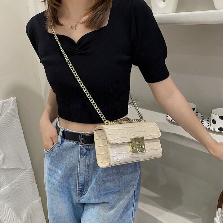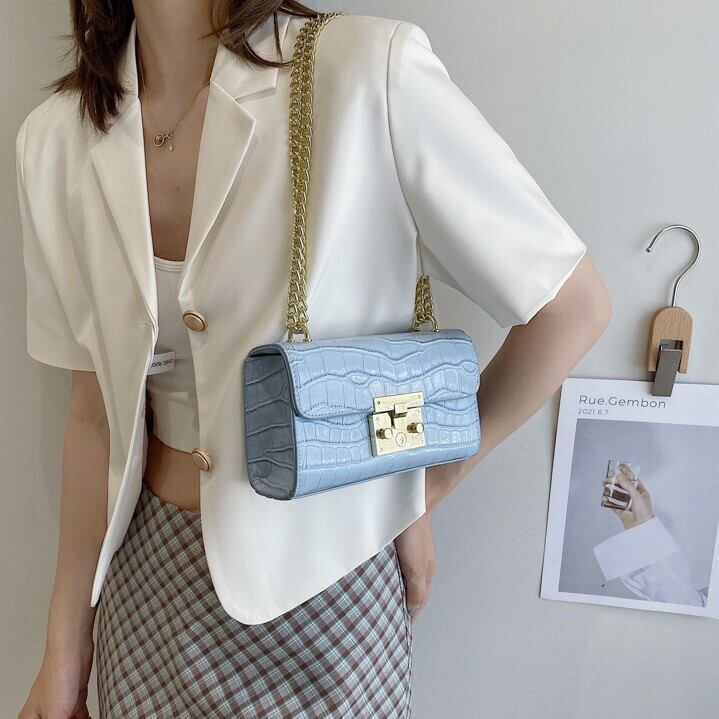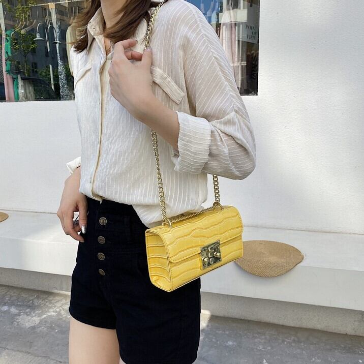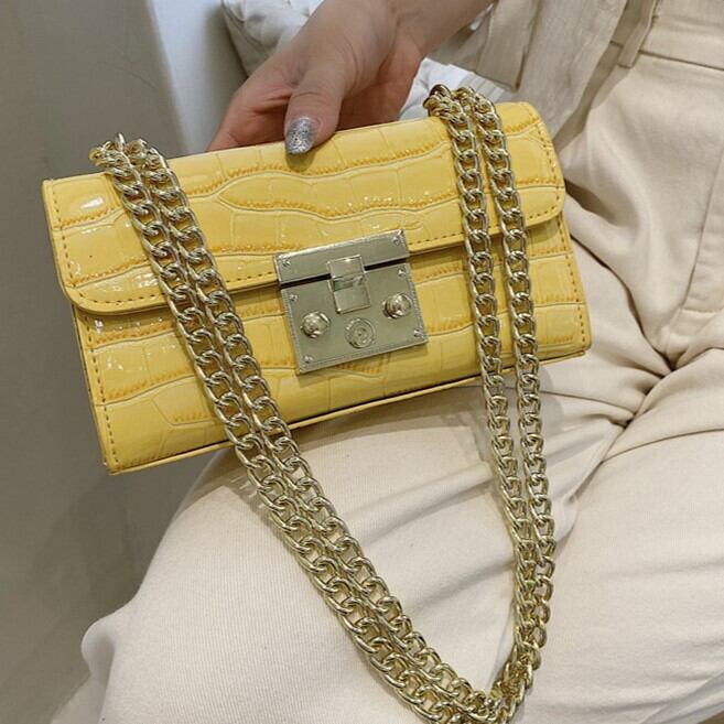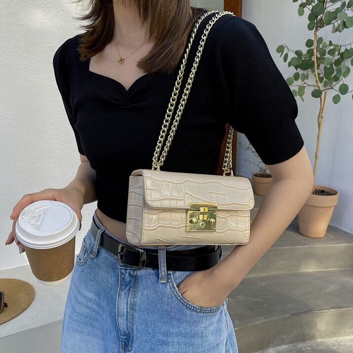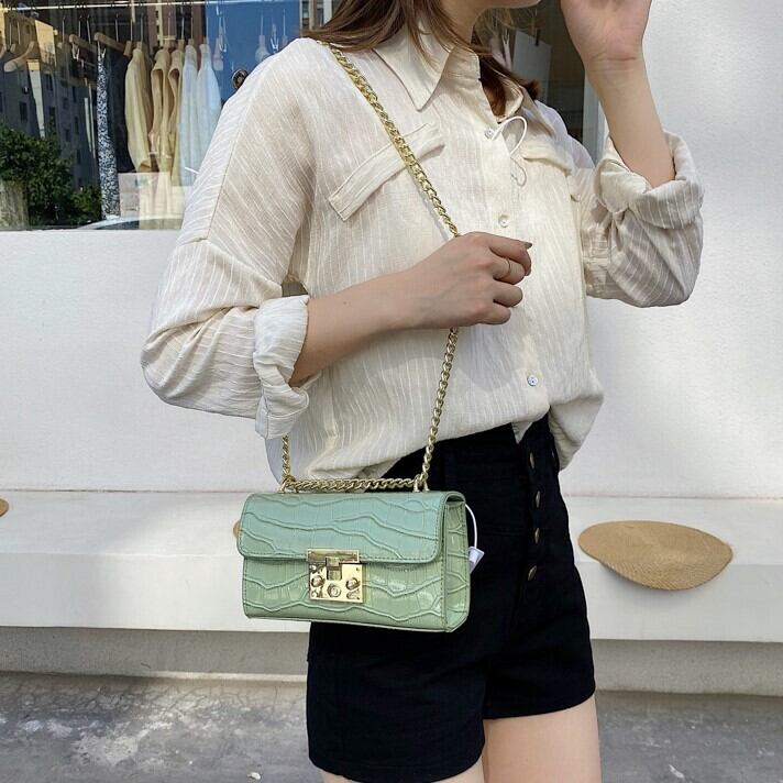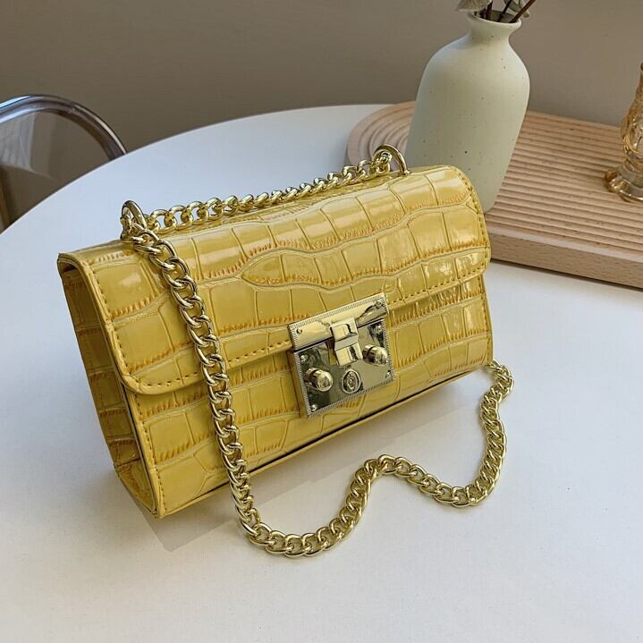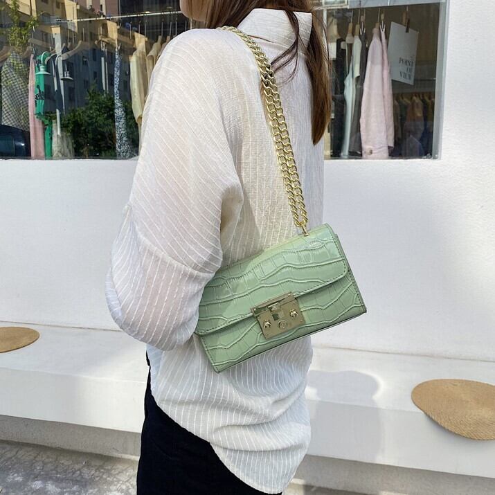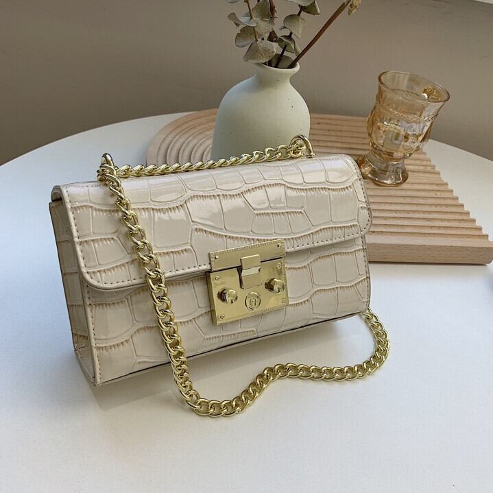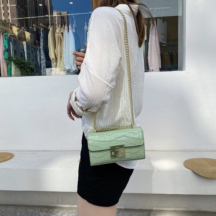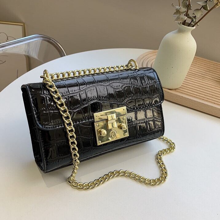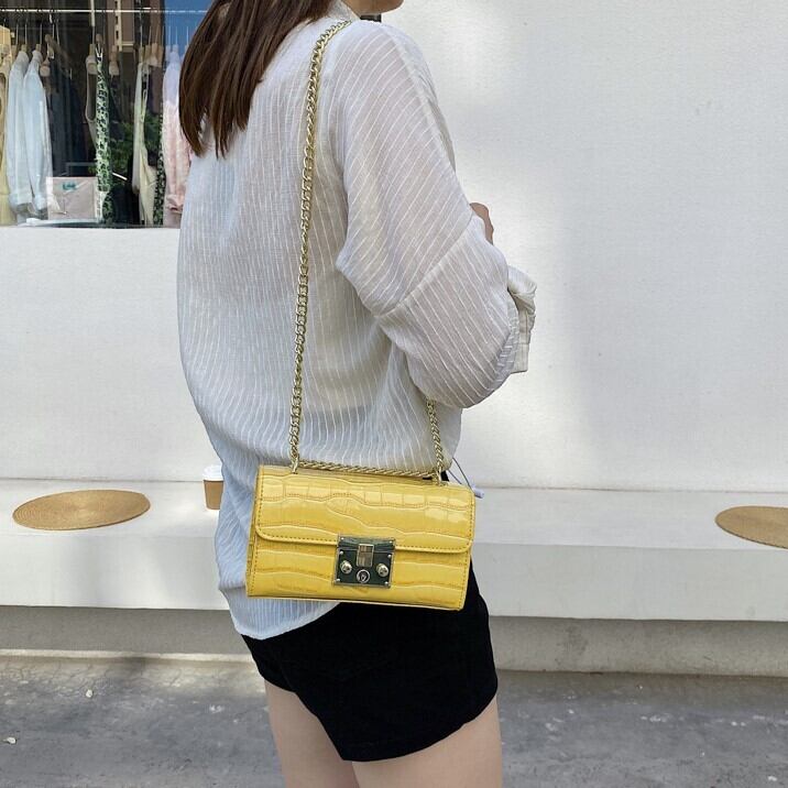 持ち手がゴールドチェーンのクロコダイルの模様のミニバッグです