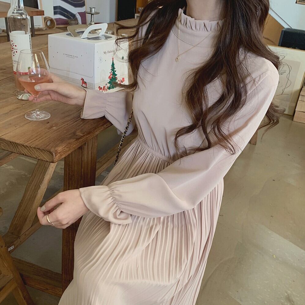 プリーツ ワンピース ロングスカート ワンピドレス 膝下 ロング丈 長袖 フレアスリーブ スタンドカラー Iライン 切り替えデザイン シフォン 透け感 薄手 かわいい 大人可愛い きれいめ 大人 上品 おしゃれ お洒落 レトロ 大人可愛い 大人女子 ラブリー キュート ガーリー エレガント 主役級 存在感 とろみ感 抜け感 無地 二次会 披露宴 クリスマス バレンタイン 10代 20代 30代 40代 レディース 女性用 ママ デート お出かけ 女子会 休日 パーティー イベント 旅行 ホテル レストラン