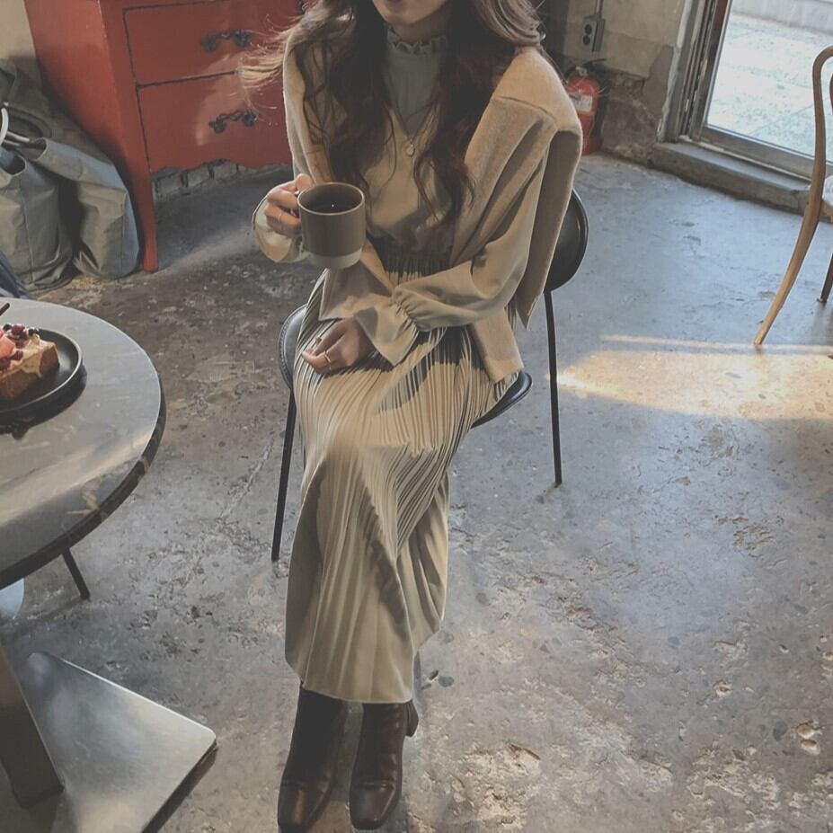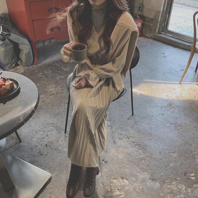 プリーツが上品なロング丈ワンピースです