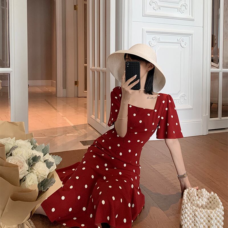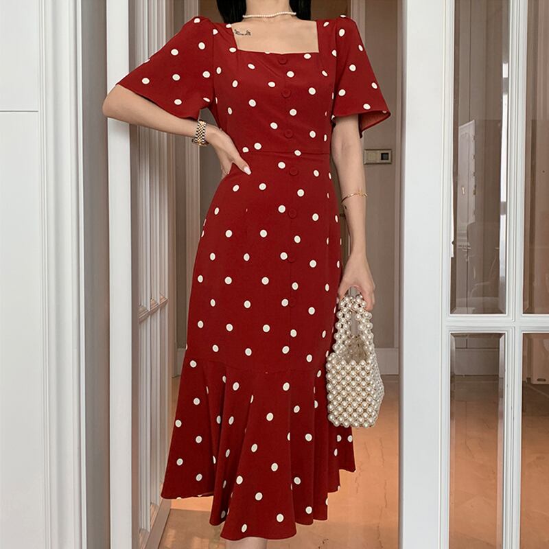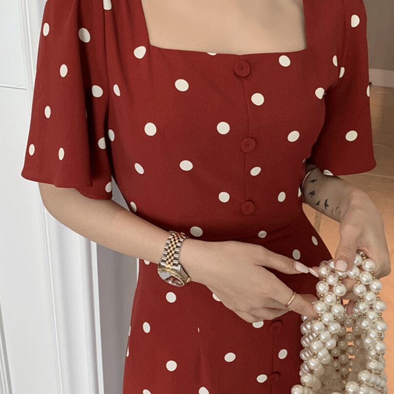 ドット ワンピース フレアワンピース ワンピドレス 膝下 ミモレ ミモレ丈 ミディアム丈 袖あり 半袖 フレアスリーブ スクエアネック 襟なし フレア スリム 細身 ペプラム 薄手 かわいい 大人可愛い 大人 おしゃれ お洒落 レトロ 大人可愛い 大人女子 ラブリー キュート ガーリー 主役級 存在感 とろみ感 抜け感 水玉 夏 10代 20代 30代 レディース 女性用 女の子 学生 デート お出かけ 女子会 パーティー イベント リゾート 旅行 着回し 普段使い モテ 黒 ブラック 赤 レッド