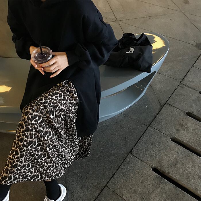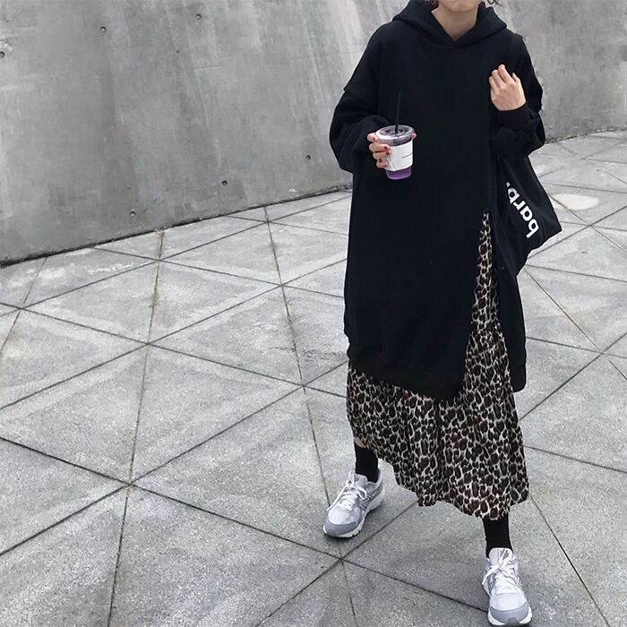 ロングパーカーは裾ファスナー付きで抜け感を演出。レオパード柄のスカートがこなれ感のある1枚。裏起毛付きで暖かく機能性も抜群です。
