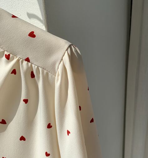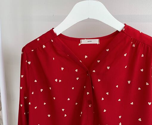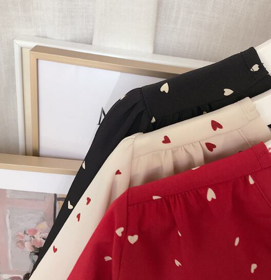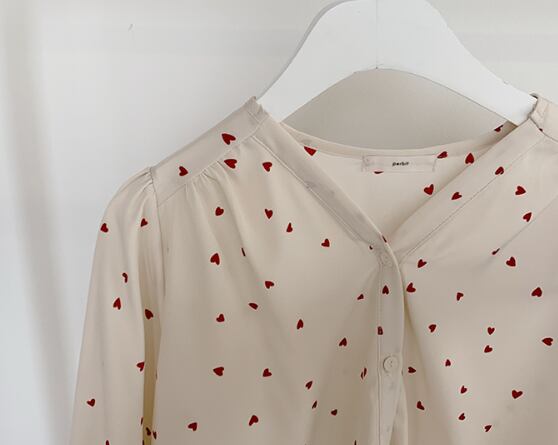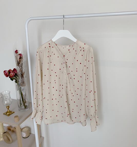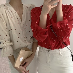 トップス ブラウス レギュラー丈 袖あり 長袖 パフスリーブ Vネック ストレート シフォン フリル 可愛い きれいめ カジュアル 上品 お洒落 大人女子 ラブリー キュート ガーリー エレガント 存在感 とろみ感 シック 柄 ハート柄 春 秋 誕生日 10代 20代 30代 女性用 ママ OL 通勤 学生 通学 デート お出かけ 女子会 休日 イベント リゾート 旅行 高原 レストラン ショッピング 外国風 コーデ モテ ギフト 安い インスタ映え 韓国風 S M L XL 黒 赤 アプリコット