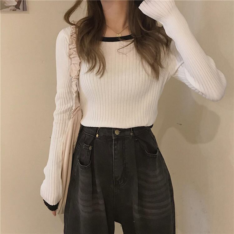 バイカラー配色のパイピングがこなれ感のあるリブニットトップス。
