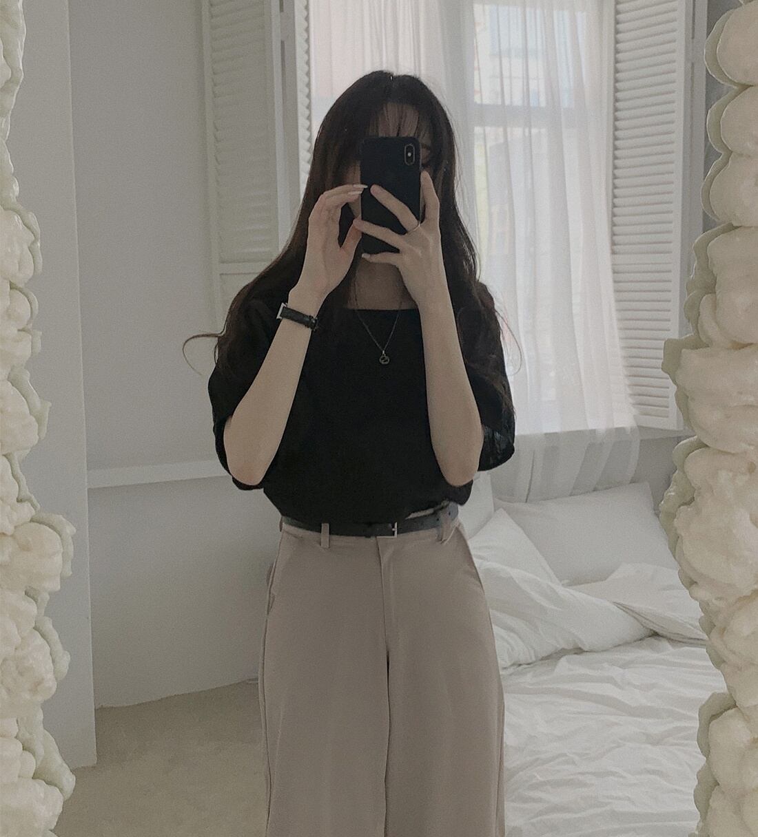 スクエアネックでデコルテラインを綺麗にみせてくれます。通勤、通学のデイリー使いからデートまで幅広く活躍します。