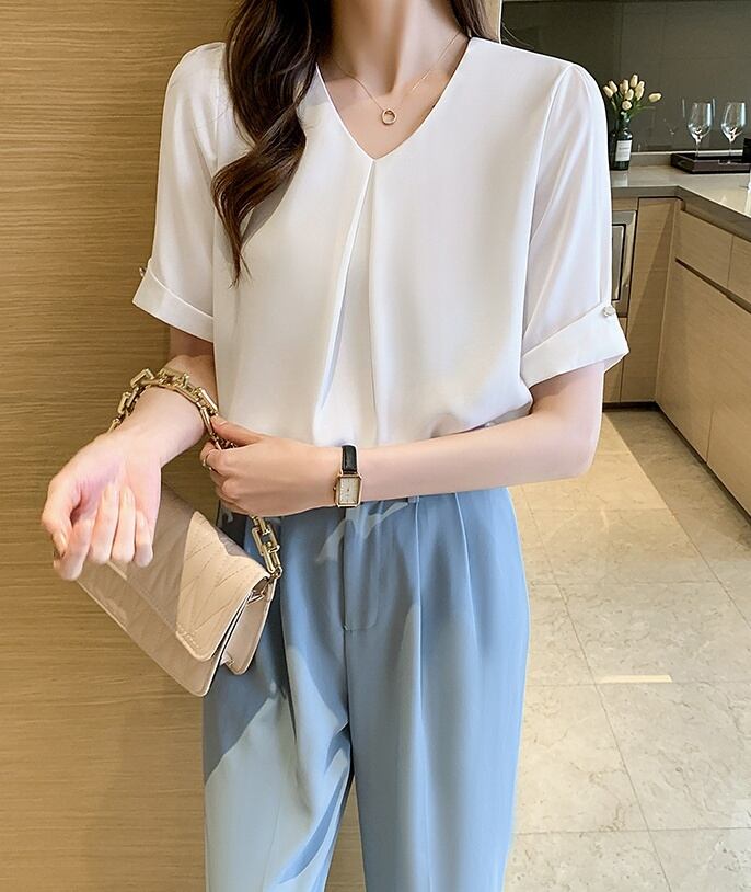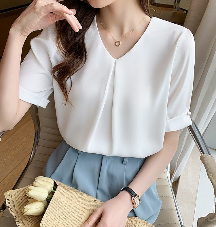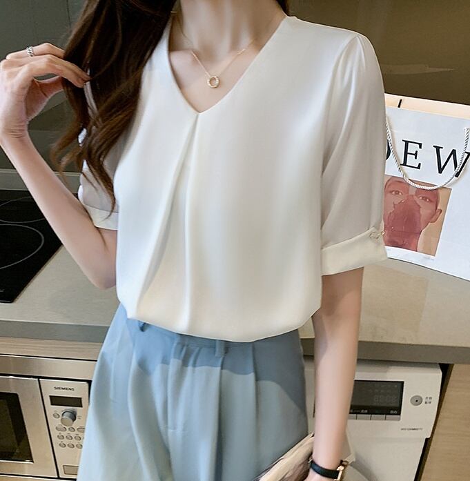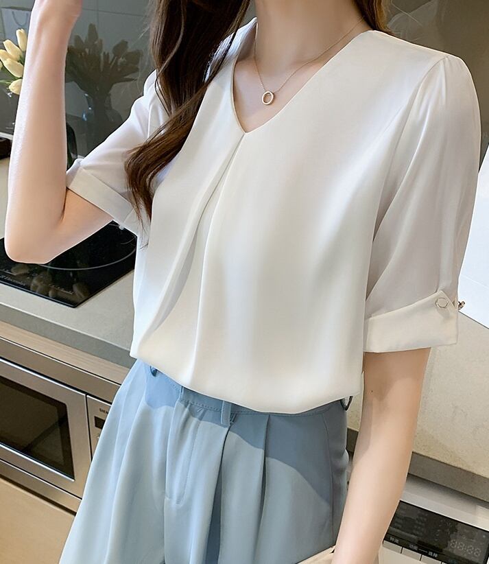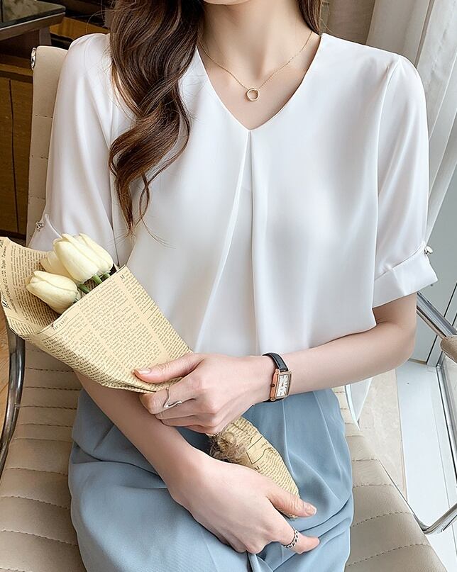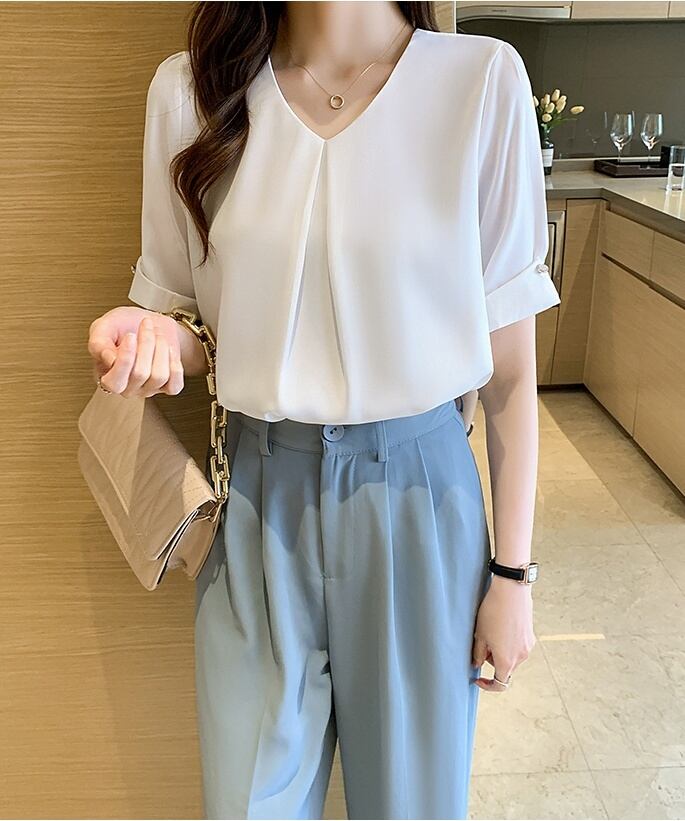 トップス ブラウス シフォンブラウス 白トップス ミディアム丈 袖あり 5分袖 Vネック ワイド シフォン フロントタック 透け感 薄手 大人可愛い きれいめ シンプル カジュアル 大人 上品 お洒落 大人女子 こなれ感 ラフ ガーリー エレガント 主役級 とろみ感 抜け感 無地 春 夏 秋 20代 30代 40代 ママ 通勤 通学 デート お出かけ 女子会 休日 旅行 着回し 普段使い 重ね着 オルチャン 楽ちん モテ 定番 トレンド 流行 インスタ映え S M L XL 2XL ブルー ホワイト