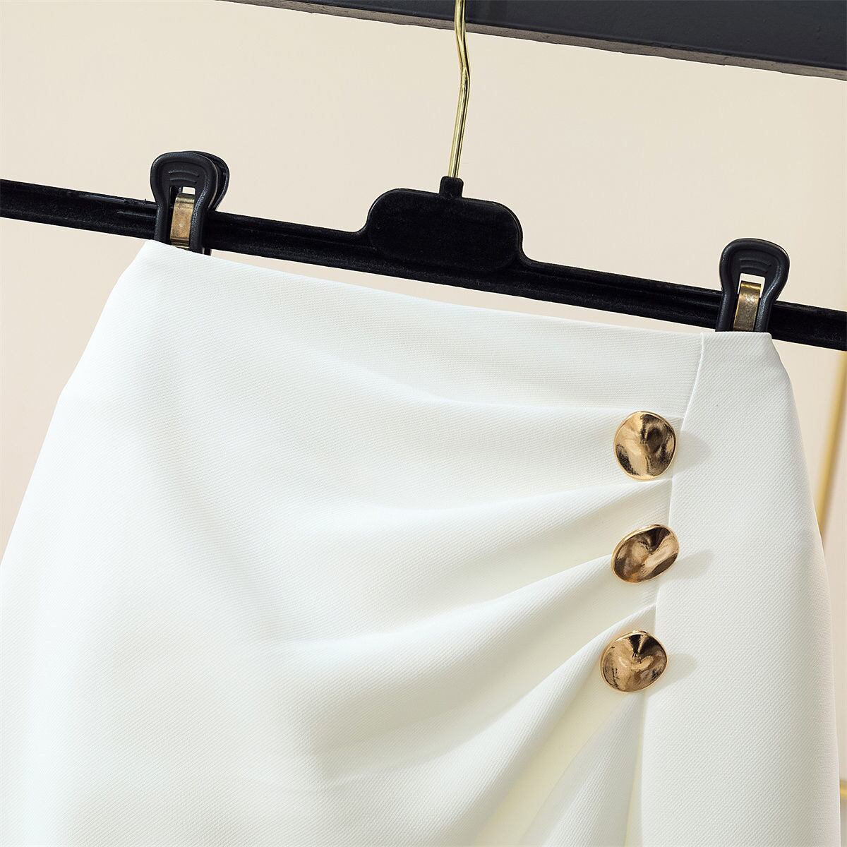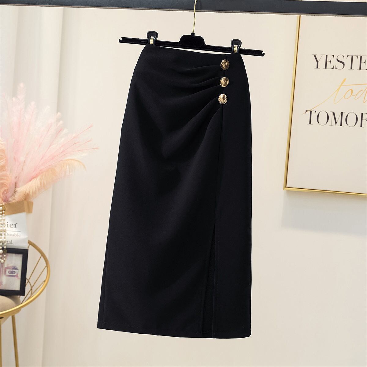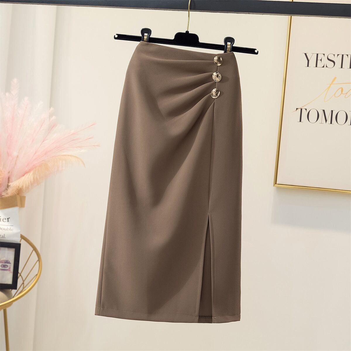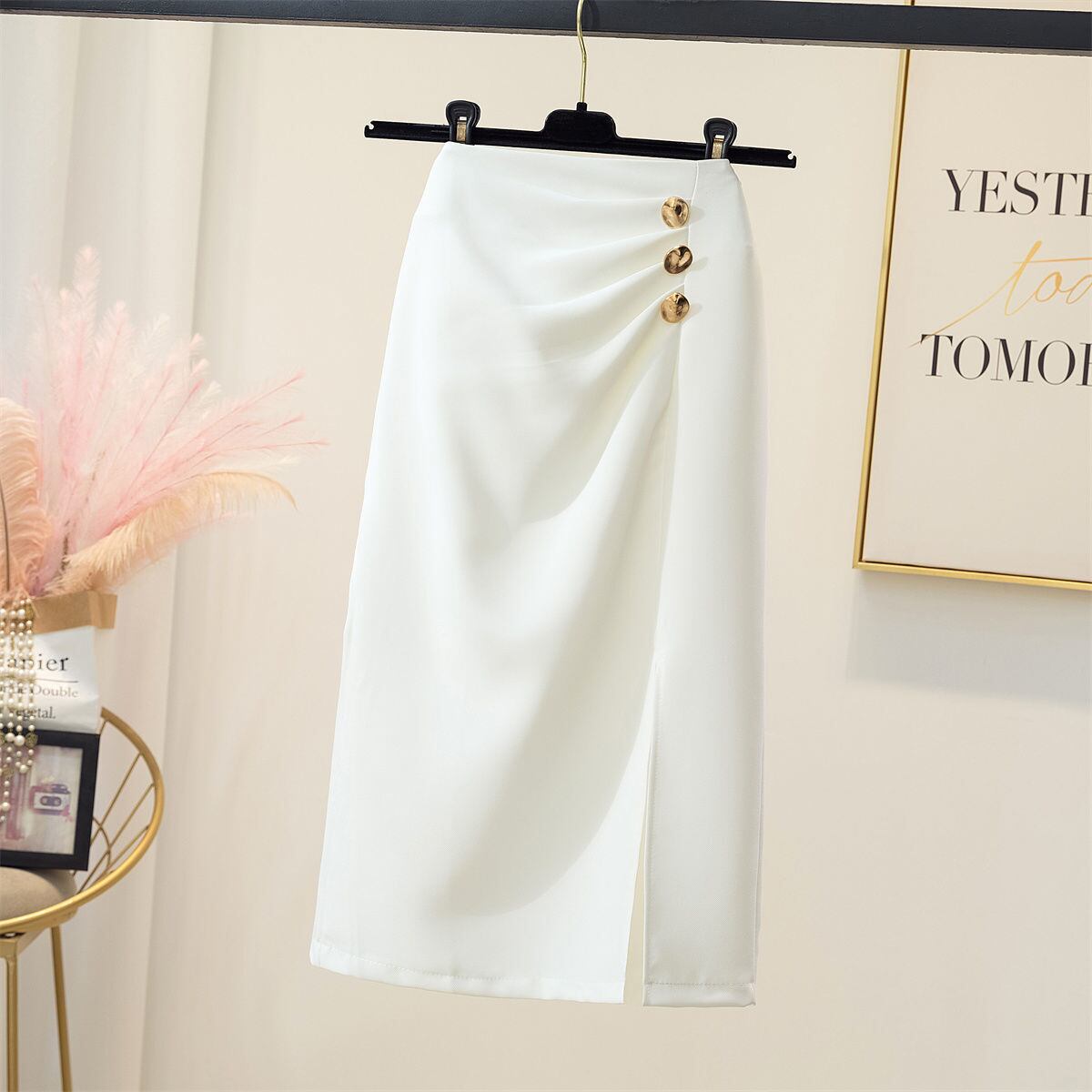 前にボタンが付いたミディアム丈のタイトスカートです