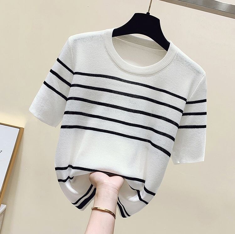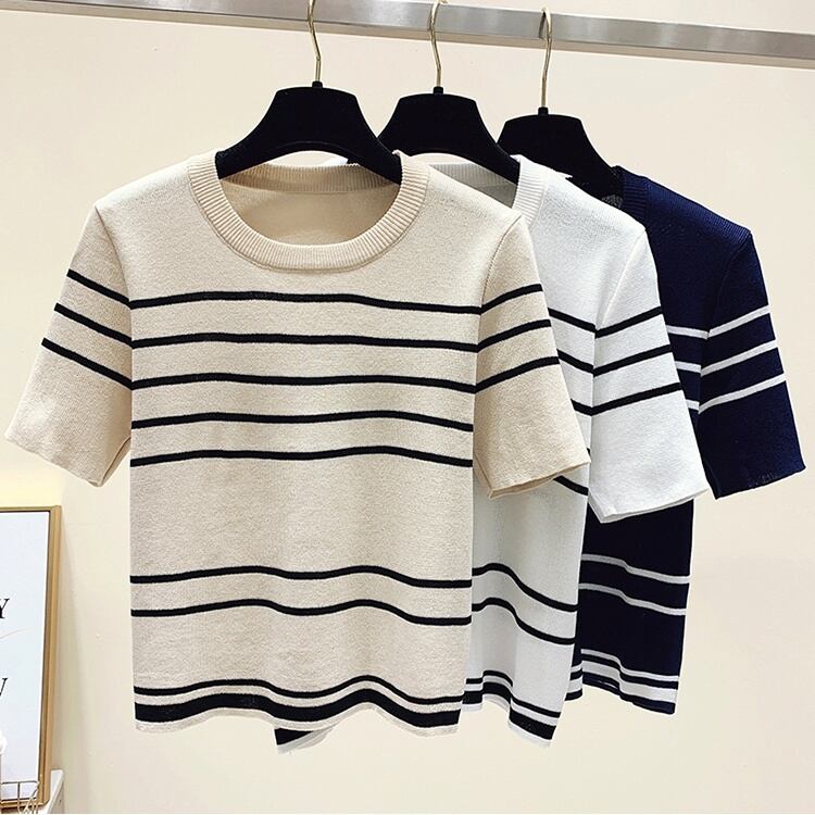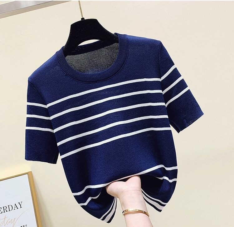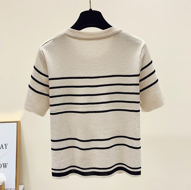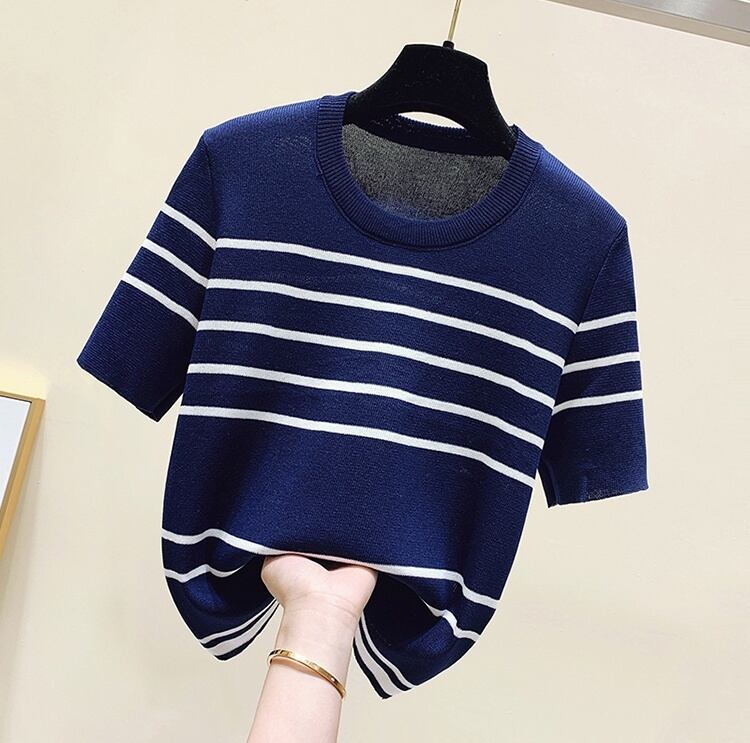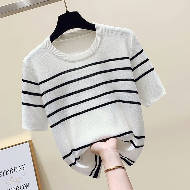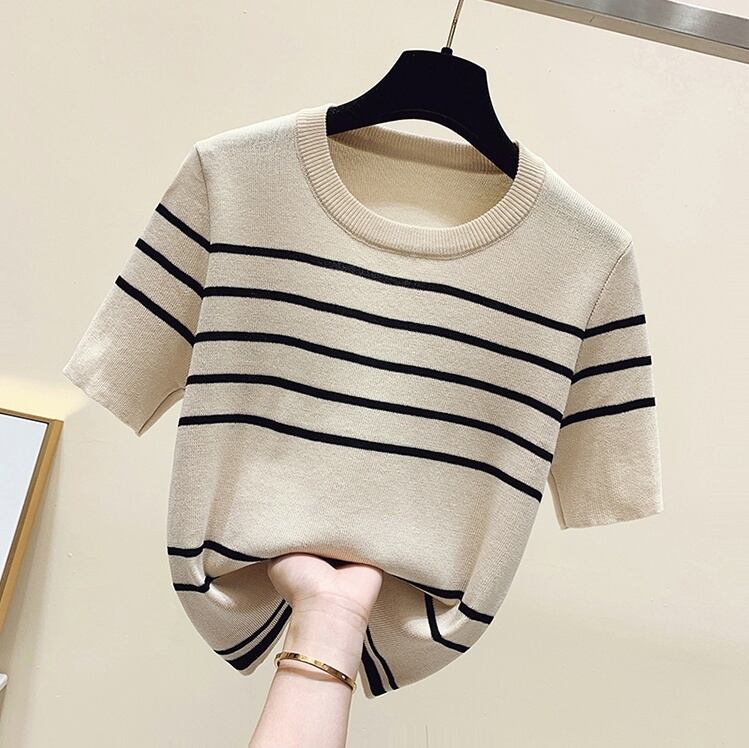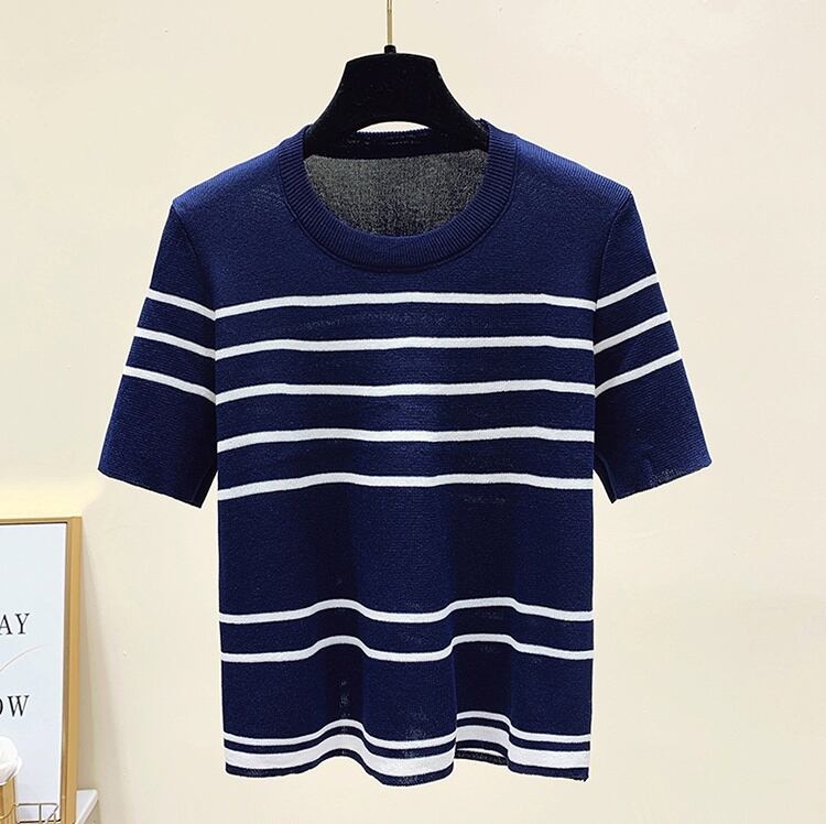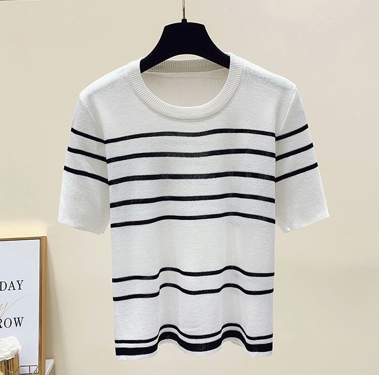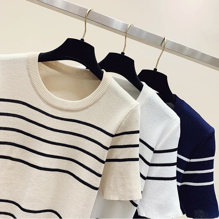 カジュアルに着こなせるストライプ柄のサマーニットトップス。
