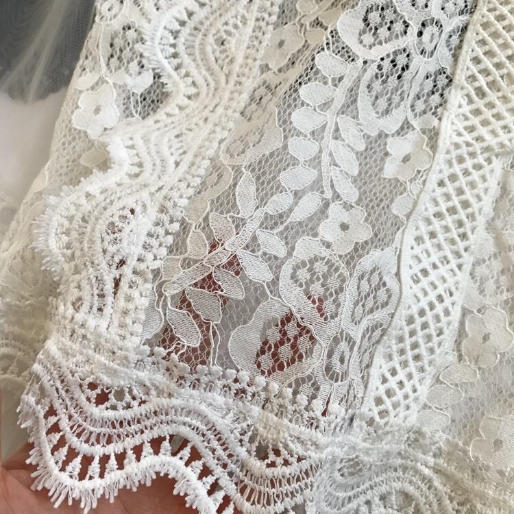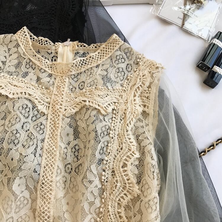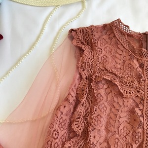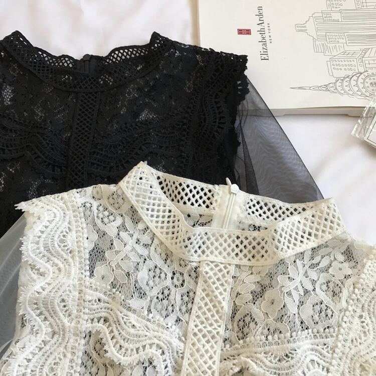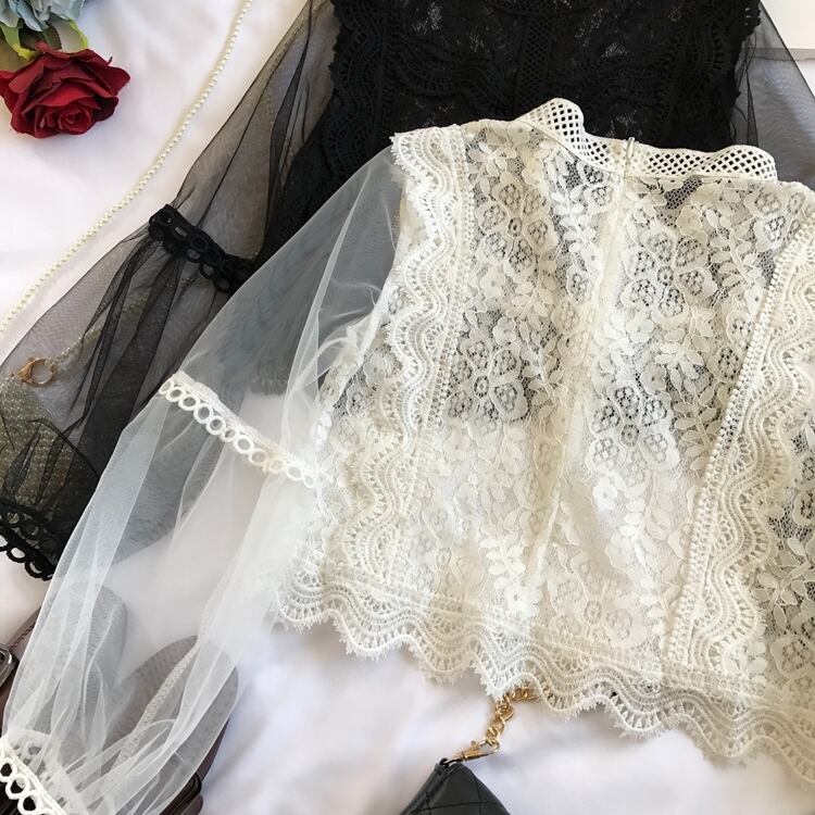 総レースデザインの前身頃に透け感のあるショルダー切り替えがフェミニンなシースルーブラウス。袖はランタンスリーブで気になる二の腕をカバーしてくれます。