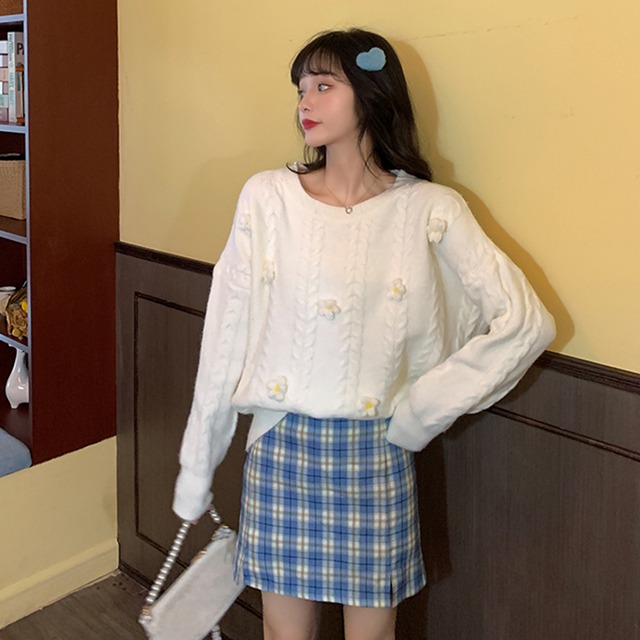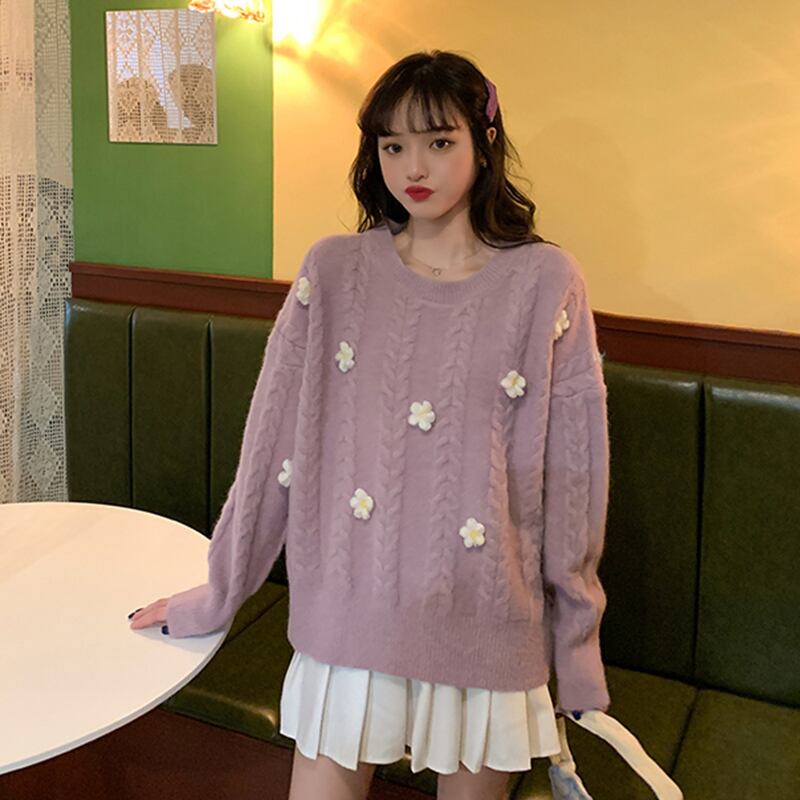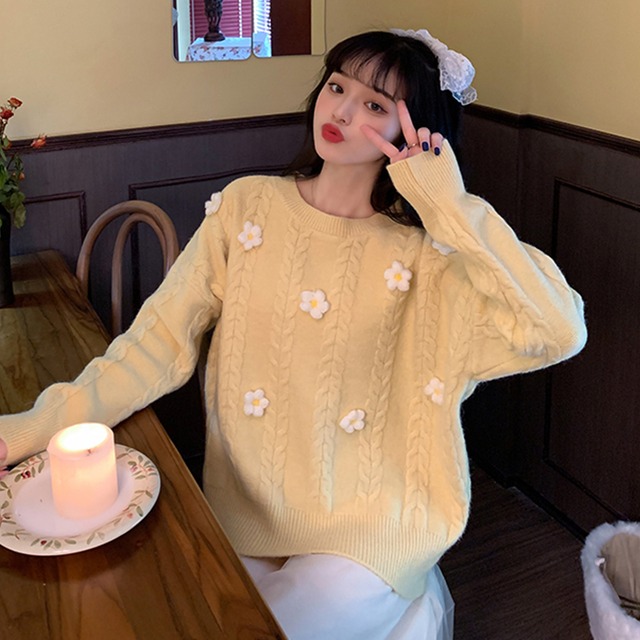 可愛い花刺繍のプルオーバーセーター