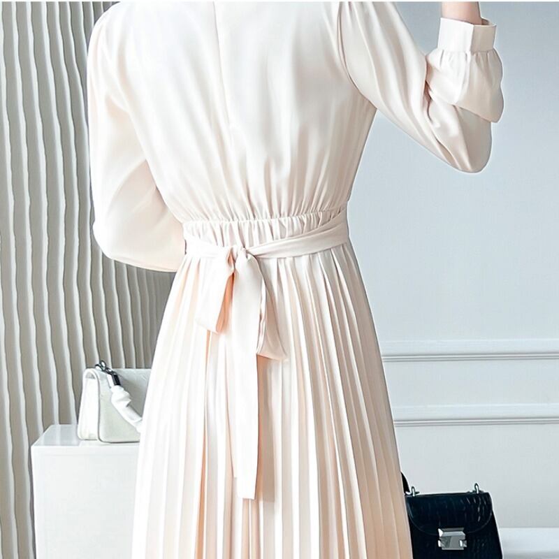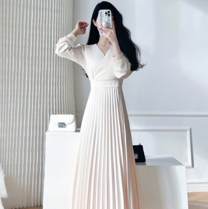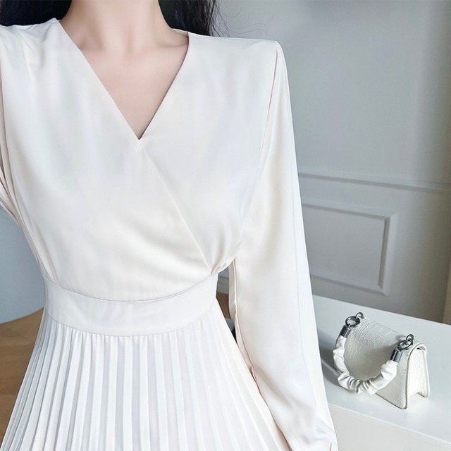 ワンピース デート フレアワンピース ミモレ ミモレ丈 袖あり 長袖 Vネック プリーツ かわいい 大人可愛い きれいめ シンプル カジュアル 大人 上品 おしゃれ お洒落 主役級 存在感 春 秋 10代 20代 30代 レディース 女性用 OL 学生 デート お出かけ 公園デビュー 女子会 休日 イベント 旅行 着回し 普段使い ファッション コーデ 楽ちん モテ トレンド 流行 インスタ映え S M L XL 白 ホワイト